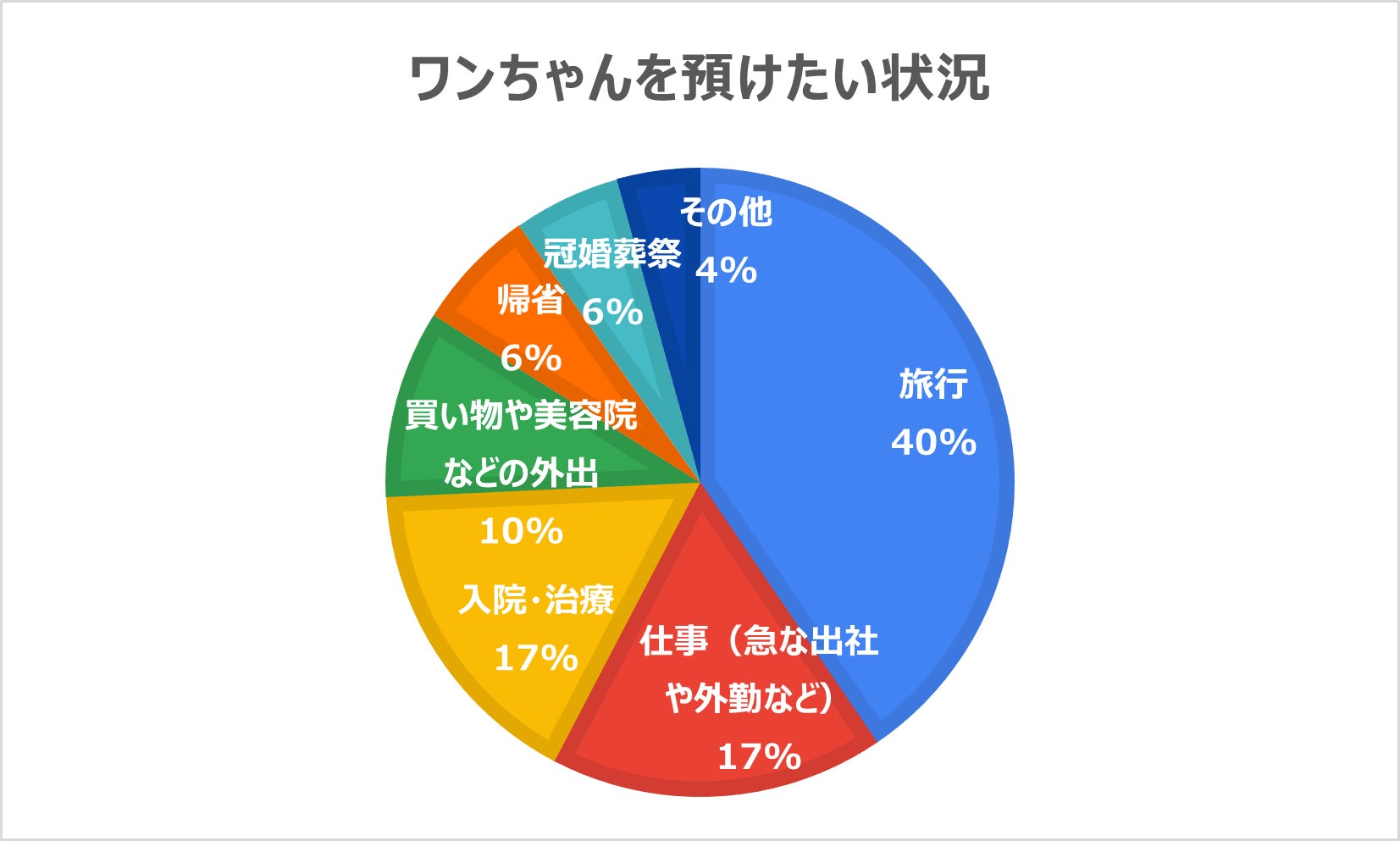 犬を預けたい状況:旅行が40%、次いで仕事、入院・治療が17%