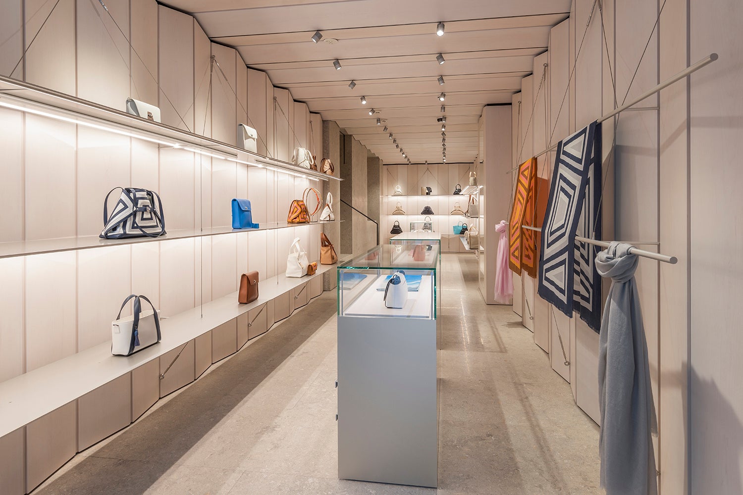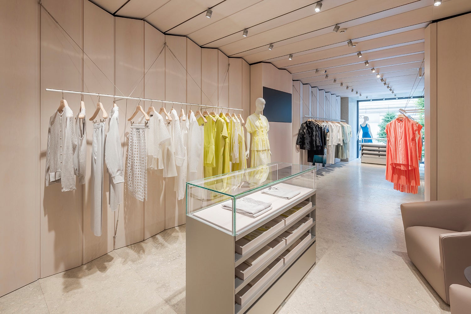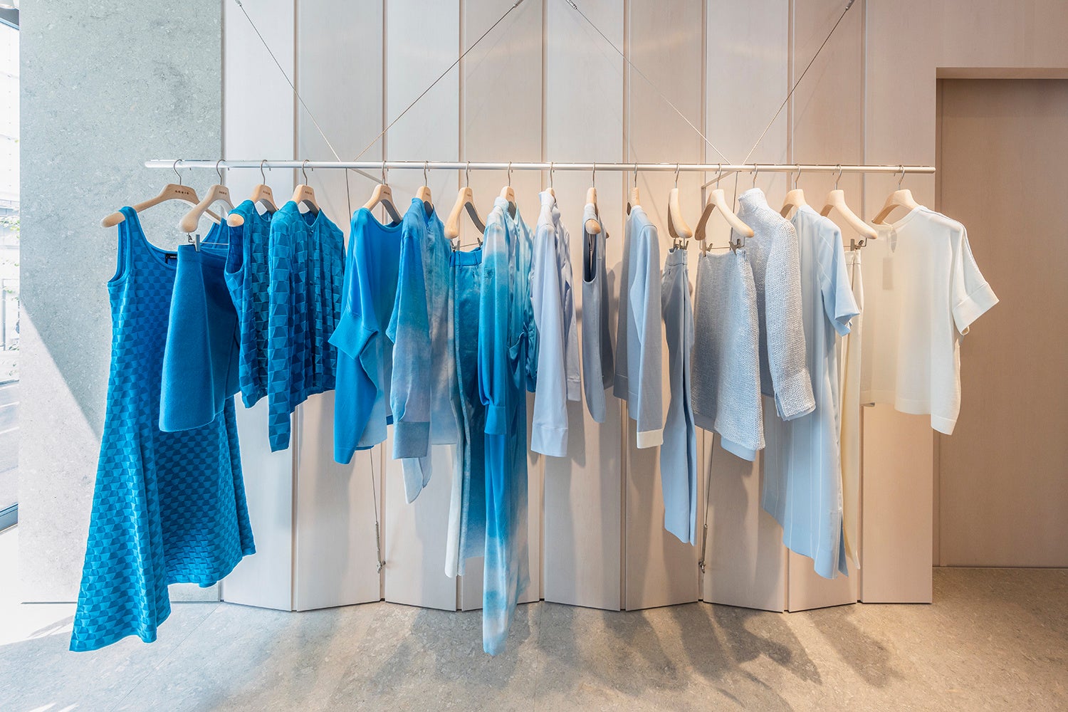 白塗りのメープル材が目を引く空間は、壁と天井一面を成形パネルで覆うことで、アルミのハンガーレールとシェルフを支える細長いケーブルを目立ちにくくし、まるで宙に浮いているようなディスプレイを演出してコレクションをエレガントに見せています。