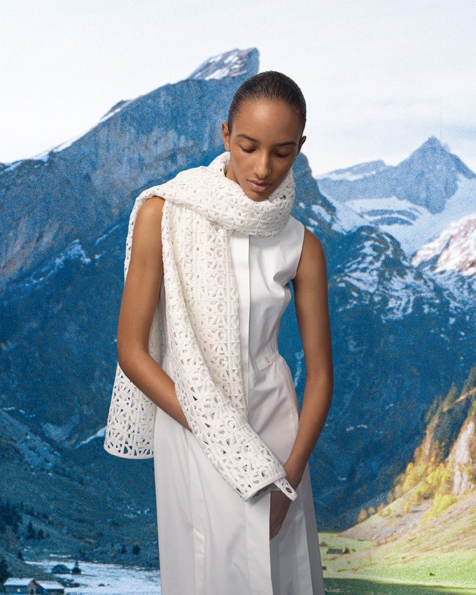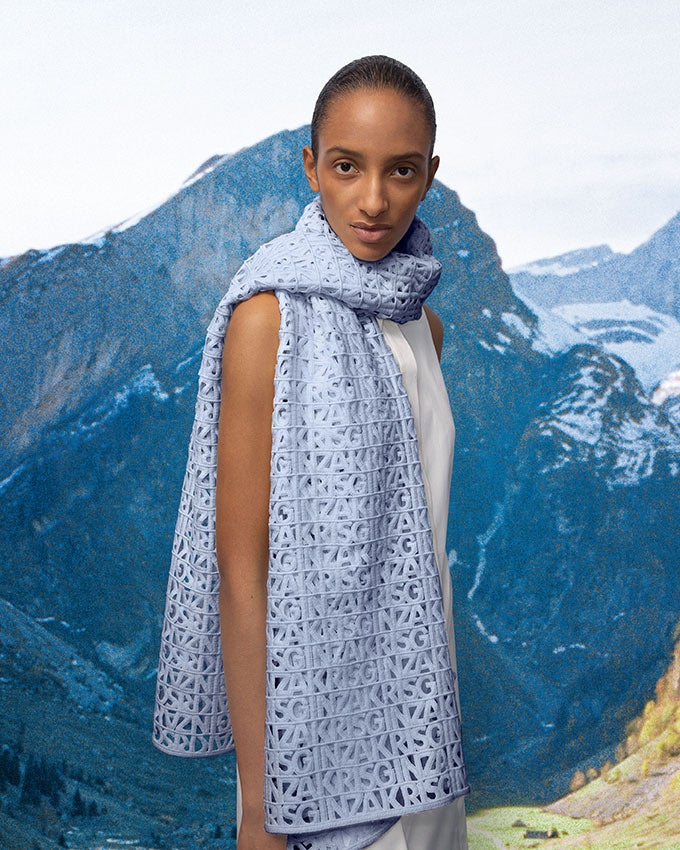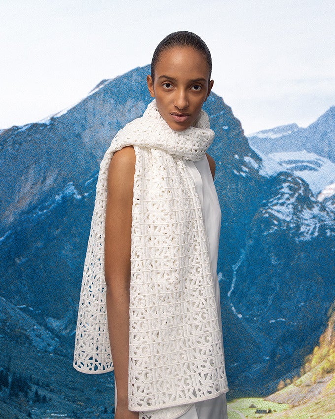 “AKRISGINZA”のロゴをザンクトガレン・エンブロイダリーでつづった贅沢なスカーフ。