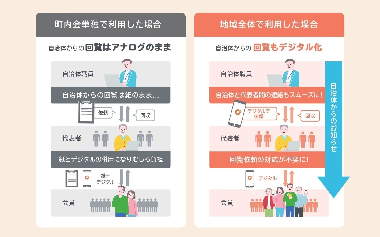 岡角さま)従来の紙による連絡には苦労を感じていました。回覧板自体は回すだけなので比較的簡単ですが、広報誌など各戸に直接配布する場合は大きな労力が伴います。実際に75世帯に配布していますが、自治会への加入率は53%と未加入世帯もあるため、ここは配布する、この家は配布しないや、役員が各戸を廻り配布するといった運用に苦労していましたね。