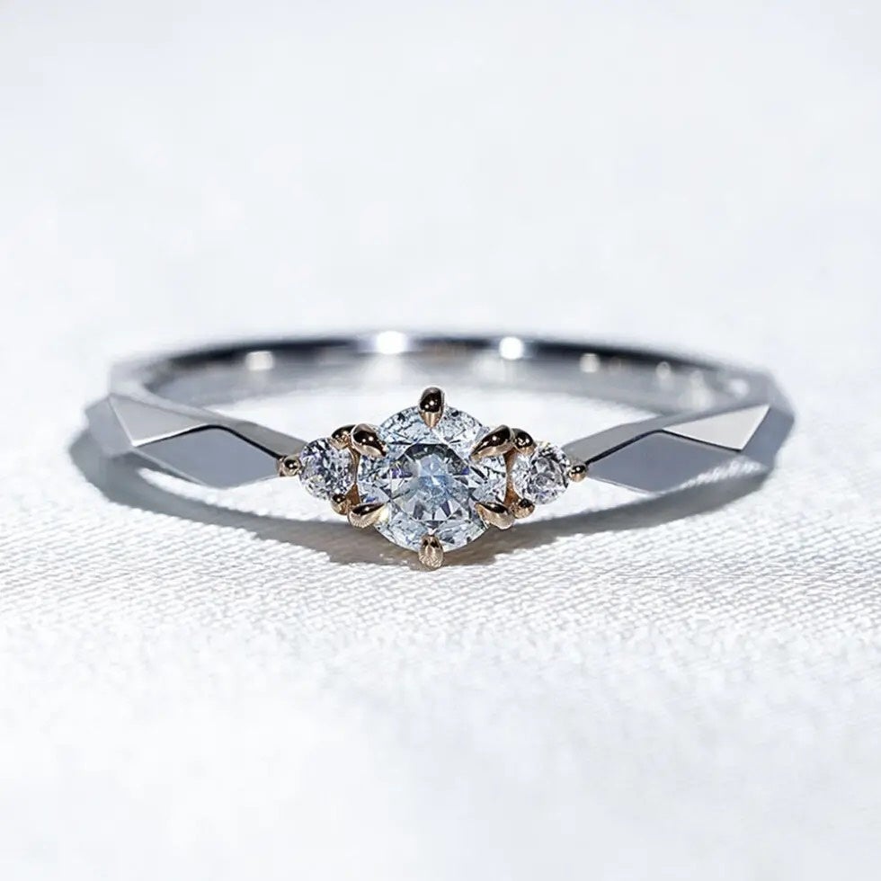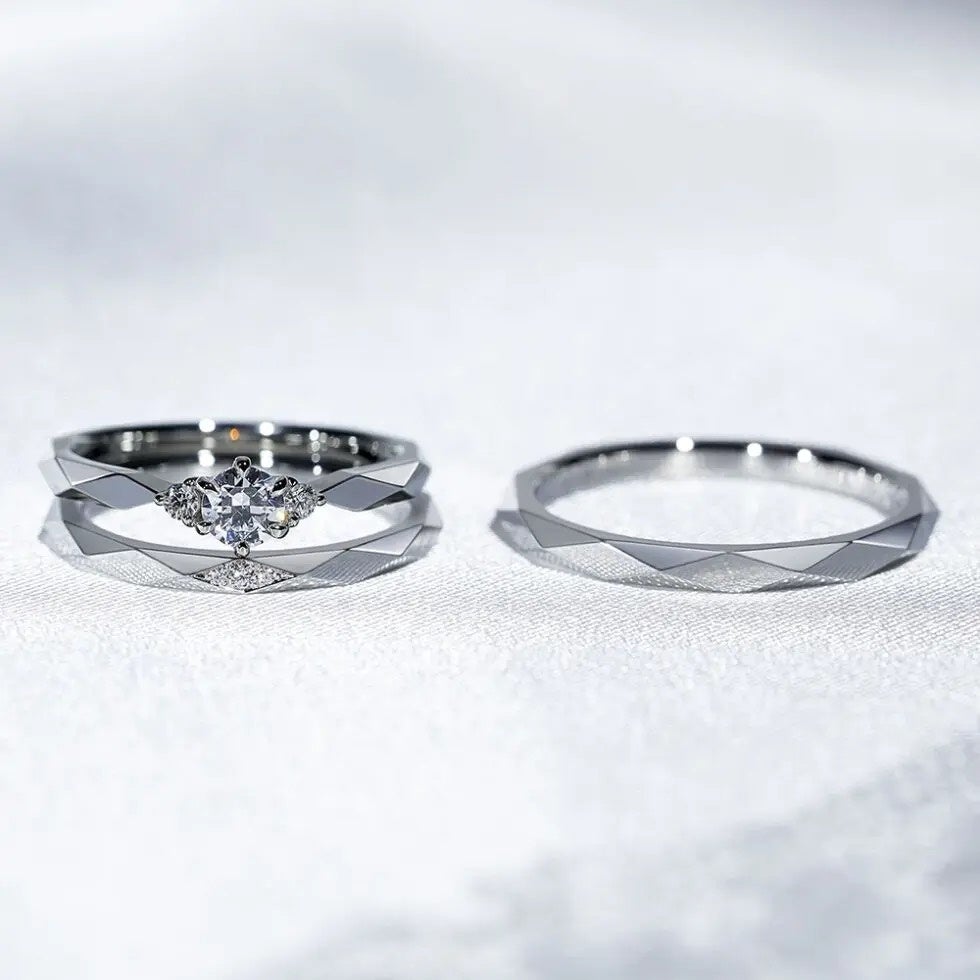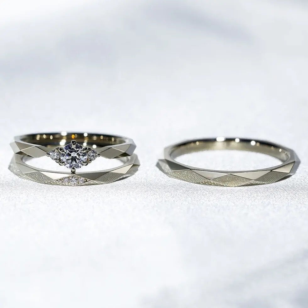 光の輝きを表現した多面カットのデザイン。一面一面の光の当たり方が様々な表情を見せてくれ、プラチナ、ゴールド、ダイヤモンドの輝きを一層引き立たせます。リングは着け心地の良さにこだわった内甲丸仕上げで、シンプルでスタイリッシュなデザインとなっております。プラチナ製に加え、シャンパンゴールド製もラインナップいたしました。