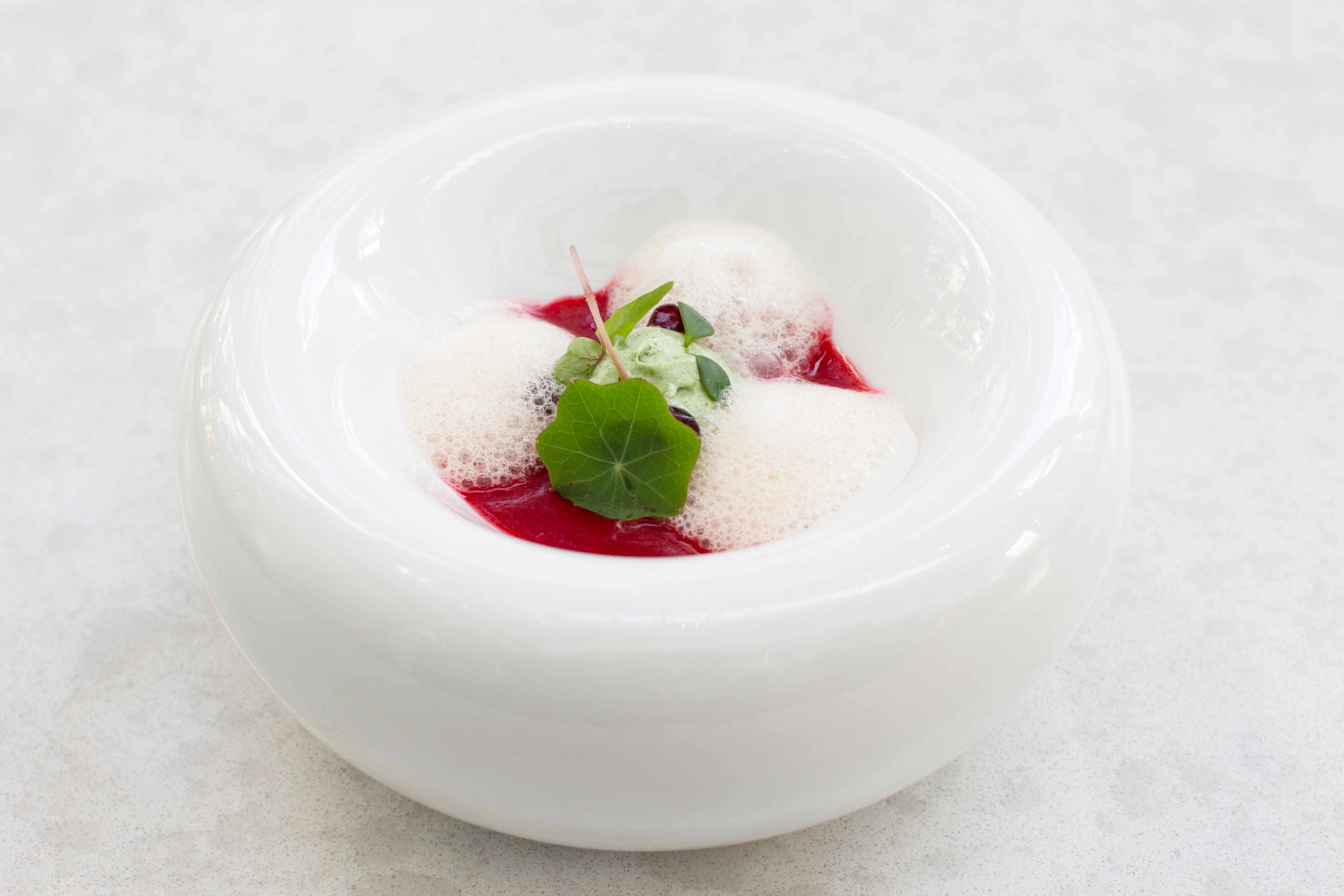 コースの期待感を高めるアミューズブッシュには、フランボワーズとザクロの酸味が利いたガスパチョをご用意。※内容は日替わりとなります。