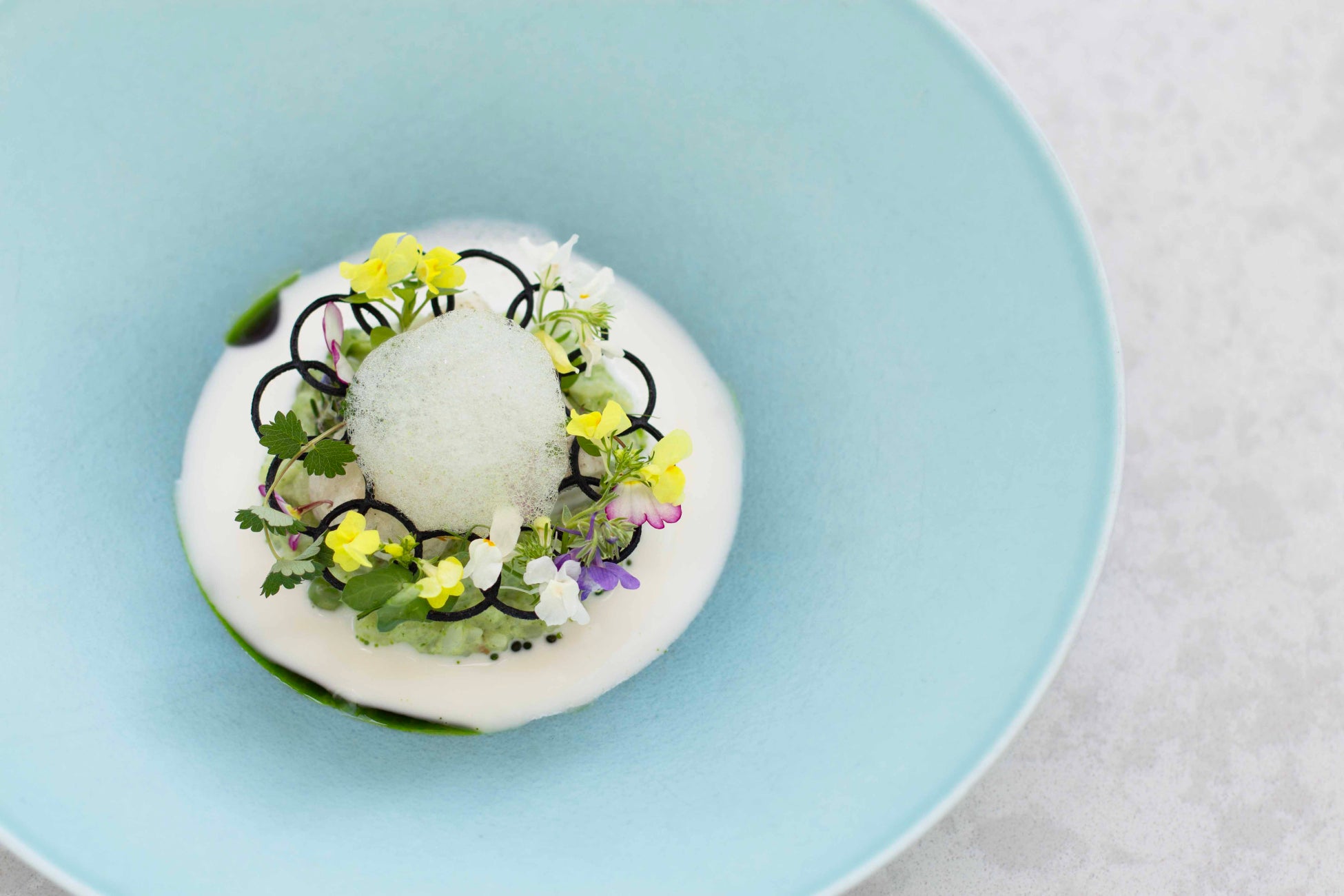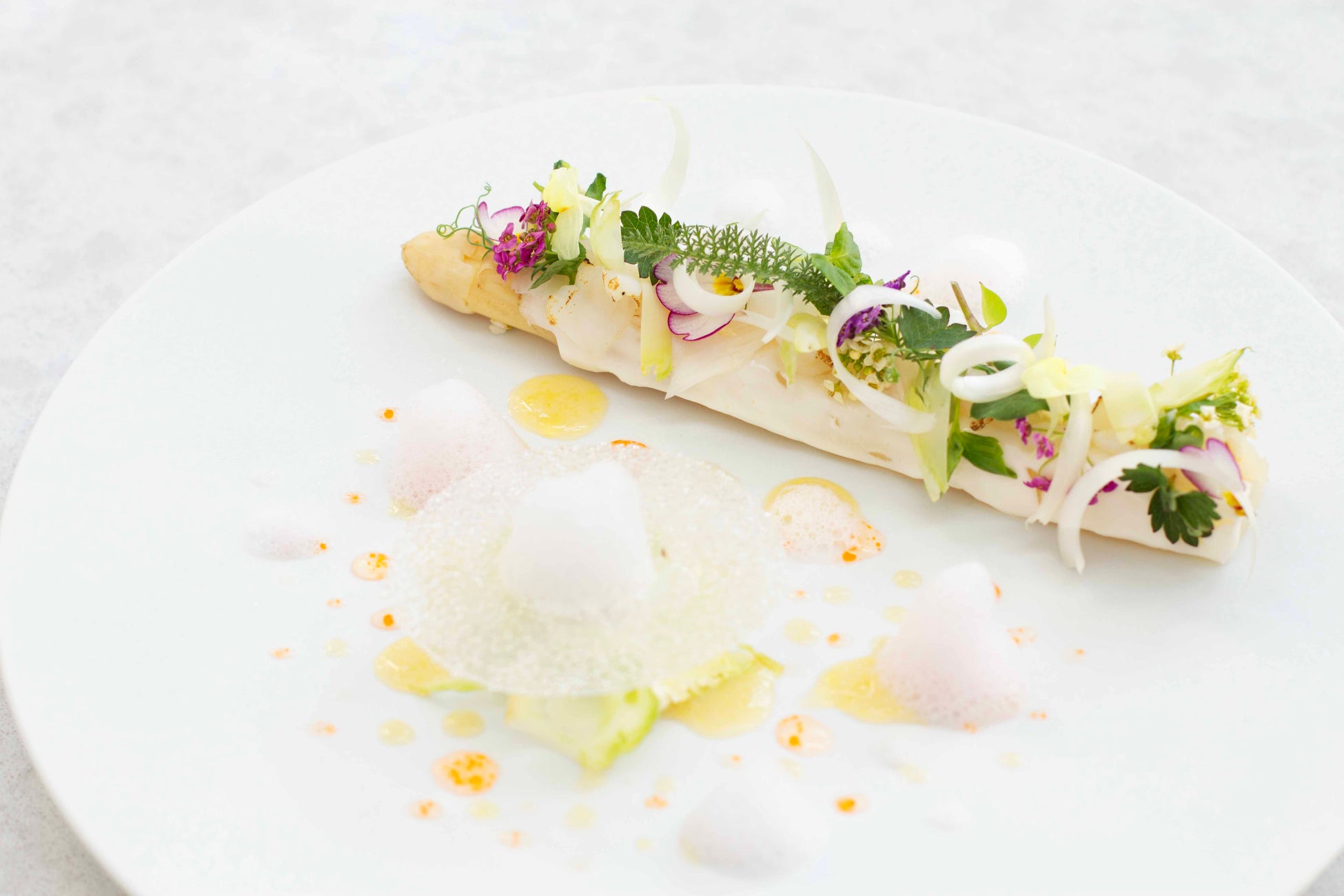 ホワイトアスパラガスのプランタニエール フランス・ノルマンディ産サンジャックとアオリイカ、トリュフ香るホワイトバルサミコとジャンボンクリュのクーリー ミニョネットのクリスタリーヌを添えて