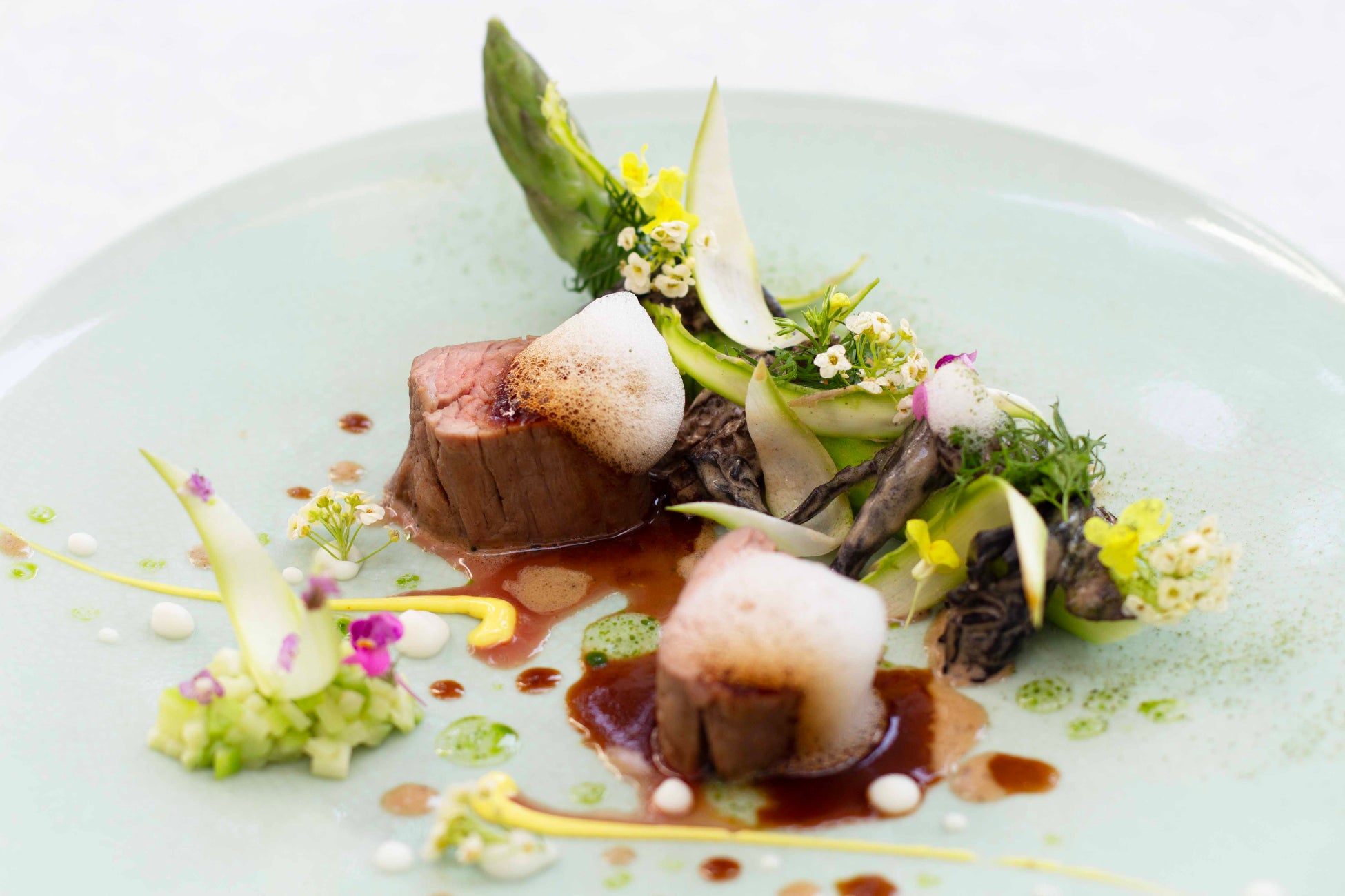 ヨーロッパ産仔牛フィレ肉のジュスキュイ モリーユ茸とシャトーシャロンのクレムー エストラゴン香るオランデーズソースとグリーンアスパラガス ローズマリーの香りと共に