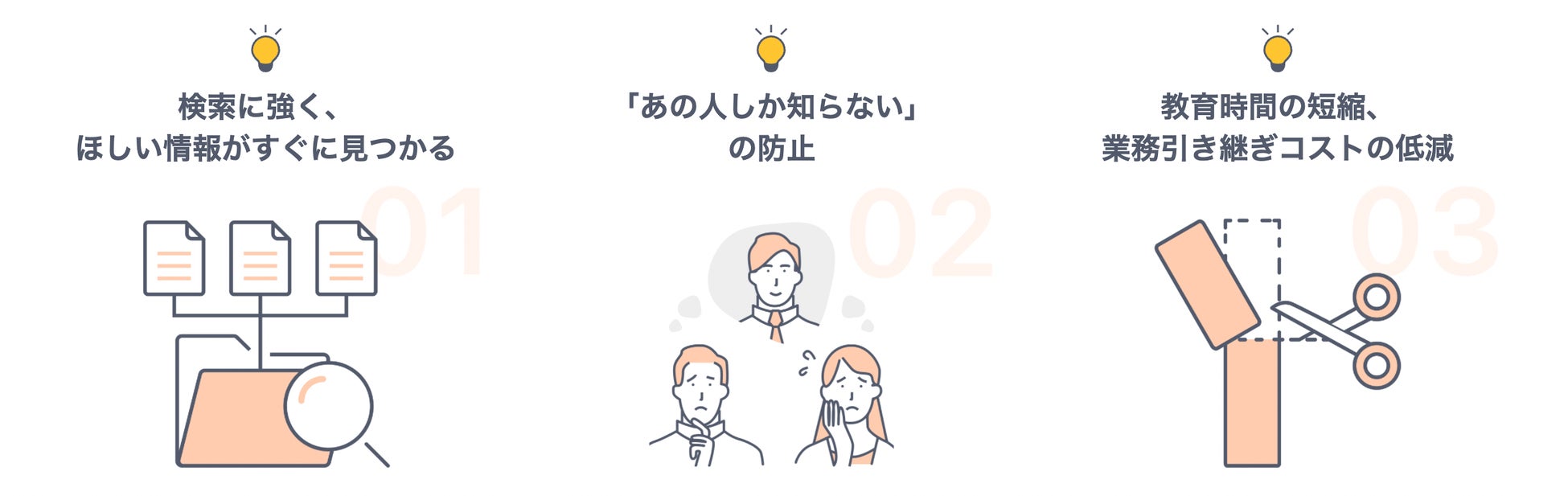 社内マニュアル、手順書、業務ノウハウ、社内FAQ、日報・議事録など、ストック型の情報管理に最適で、