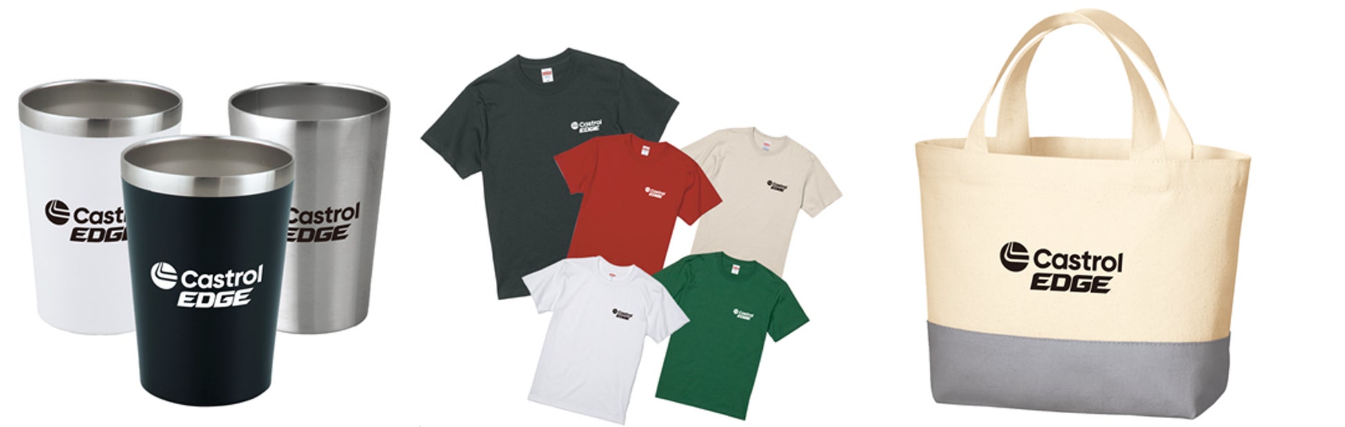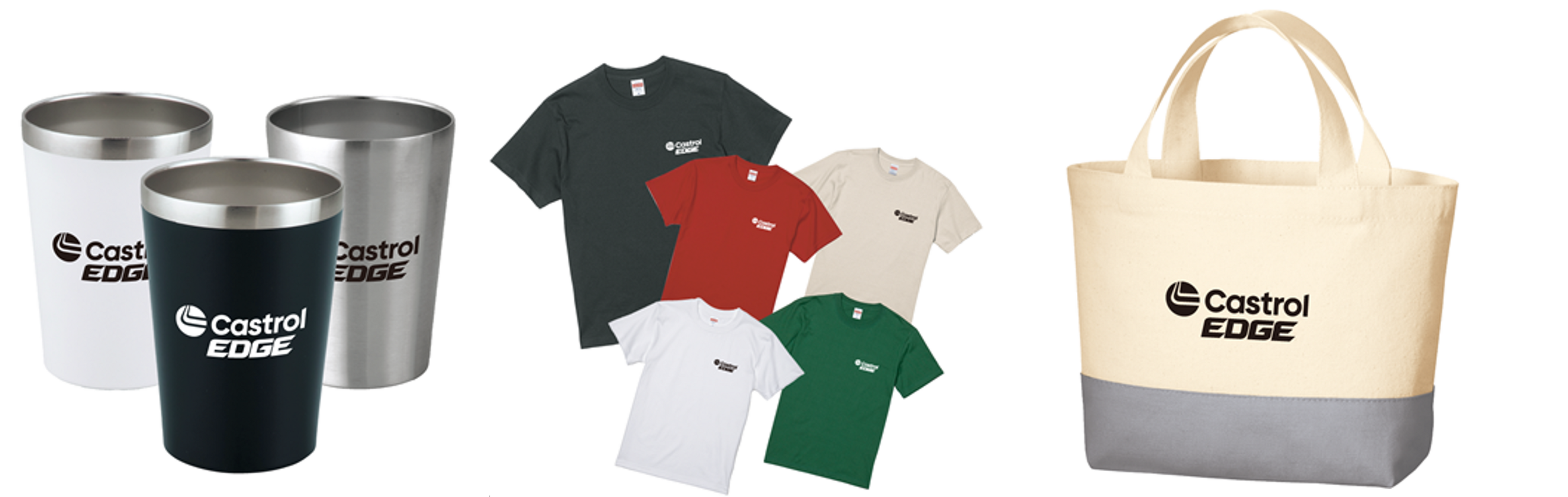キャンペーンページ(https://www.edgecampaign.jp/)にアクセスし、必要事項に答えて応募すると、ロゴ入りのオリジナル「保冷温ステンレスタンブラー」または「オリジナルTシャツ」をもれなくプレゼントします。また、「カストロール エンジンシャンプー」を同時購入して応募すると、ロゴ入りのオリジナル「カラーボトムキャンバストート」をもれなくプレゼントします。