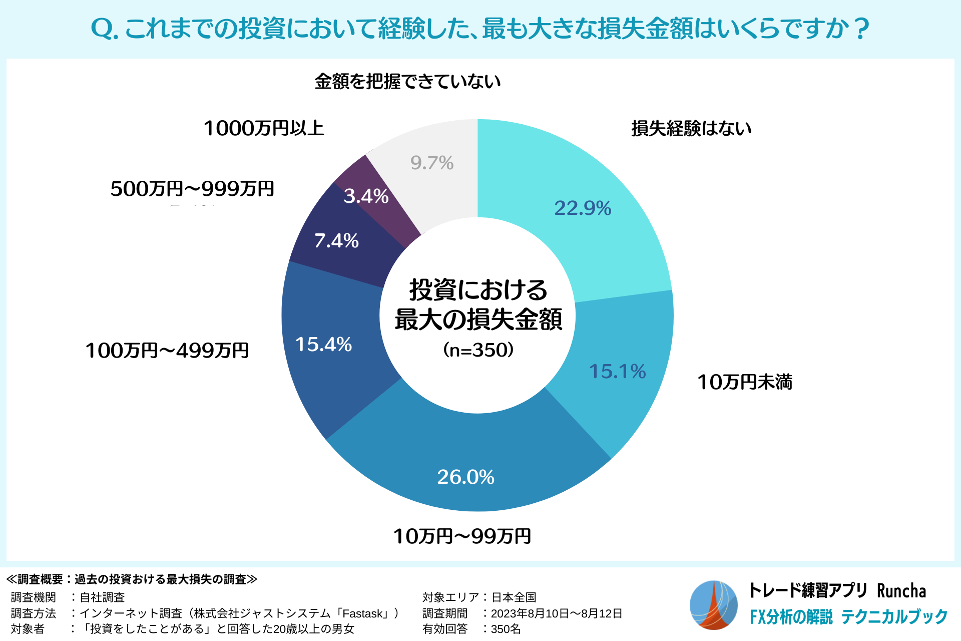 また、生活に打撃を受けるような損失の背景には、「急激な相場変動」と「損切りの遅れ」があることが圧倒的に多いことが分かりました。「急激な相場変動」を完全に予測することはできませんが、テクニカル分析などを活用して、少しでも巻き込まれる可能性を減らせるよう準備しておきたいところです。