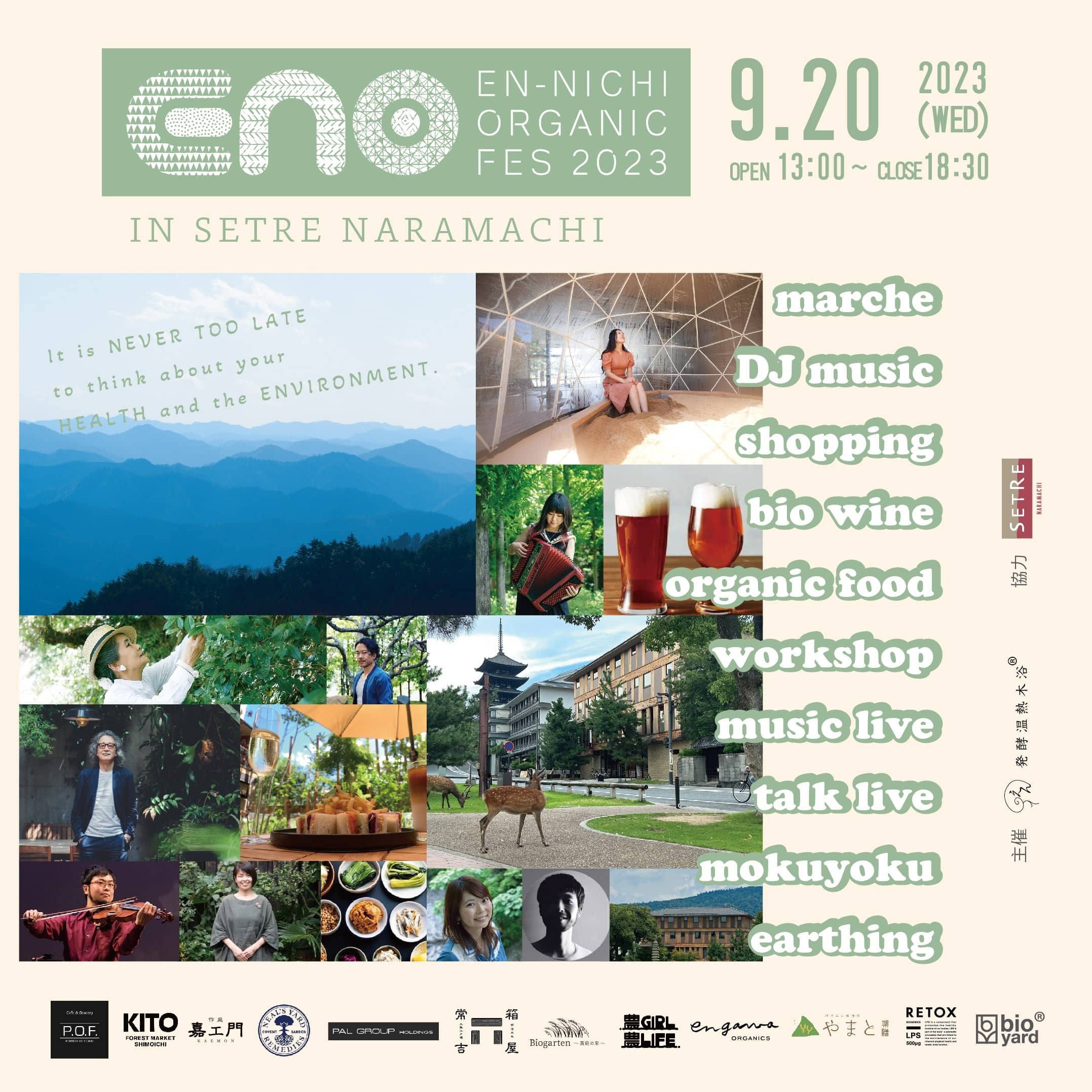 2023年9月20日(水)EN-NICHIオーガニックフェス2023。奈良のホテル セトレならまちを完全貸切し、マルシェやトークショー、DJブース、ビオワイン、生演奏ライブなど半日楽しめるフェスを開催