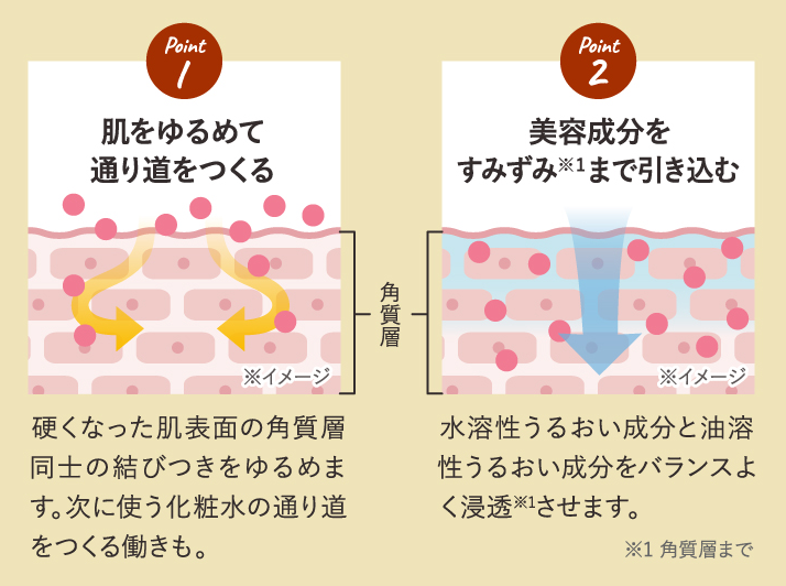 さらにナノ化したことで硬くなった肌表面の角質層同士の結びつきをゆるめるので、次に使う化粧水の通り道をつくってくれます。