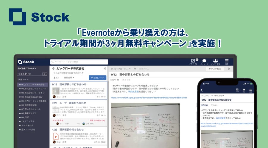 「Evernote」から「Stock」にお乗り換えを検討している方を対象として、【通常1ヶ月の無料トライアル期間を、3ヶ月に延長するキャンペーン】を実施します。