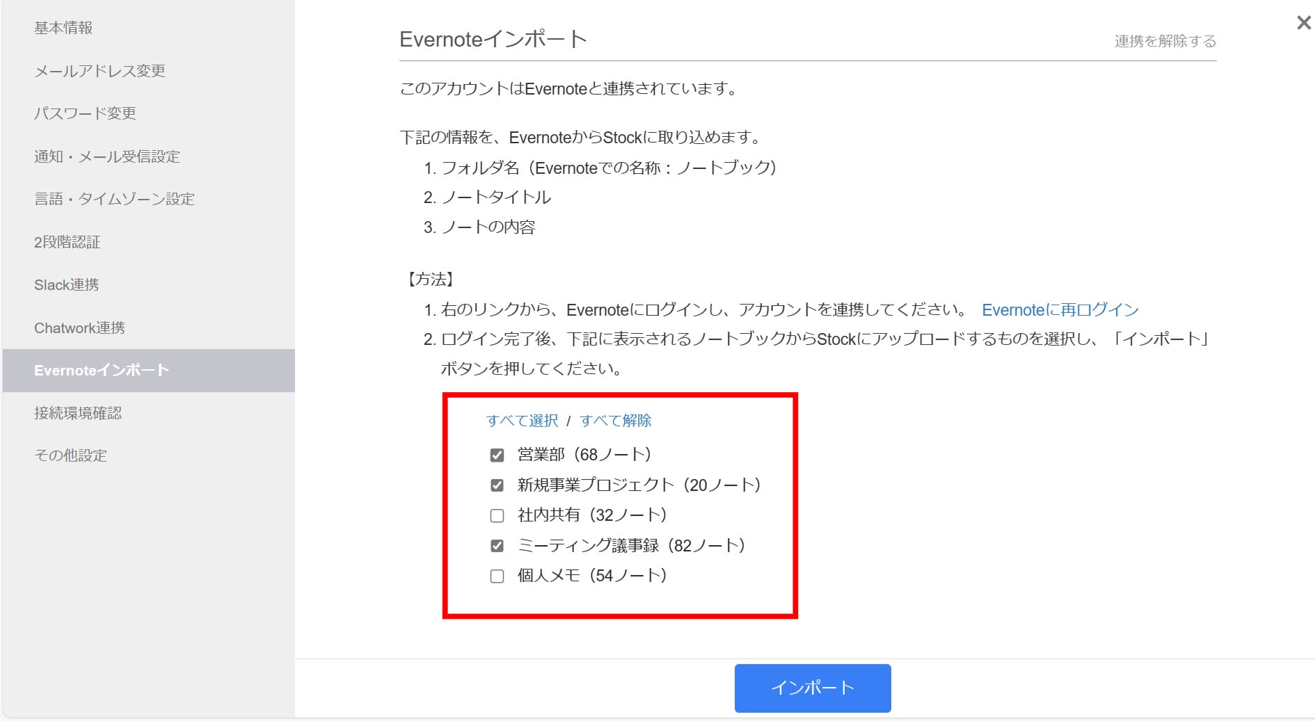 更に、下記の通り「EvernoteからStockへのインポート機能」をご用意しているので、全く手間をかけずに、従来Evernoteに記載していた内容を、そのままStockに移行できることも、大きな魅力です。