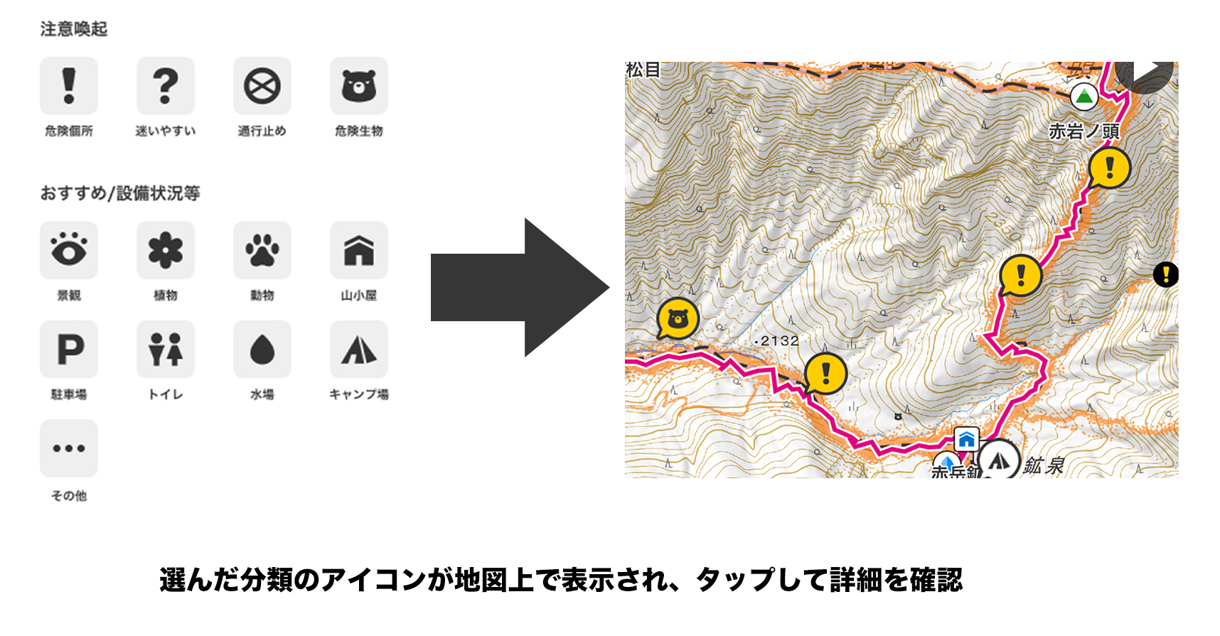 登山者が分類を指定し写真やコメントを投稿すると、地図上に分類ごとのアイコンが表示され、タップすると内容を確認できます。