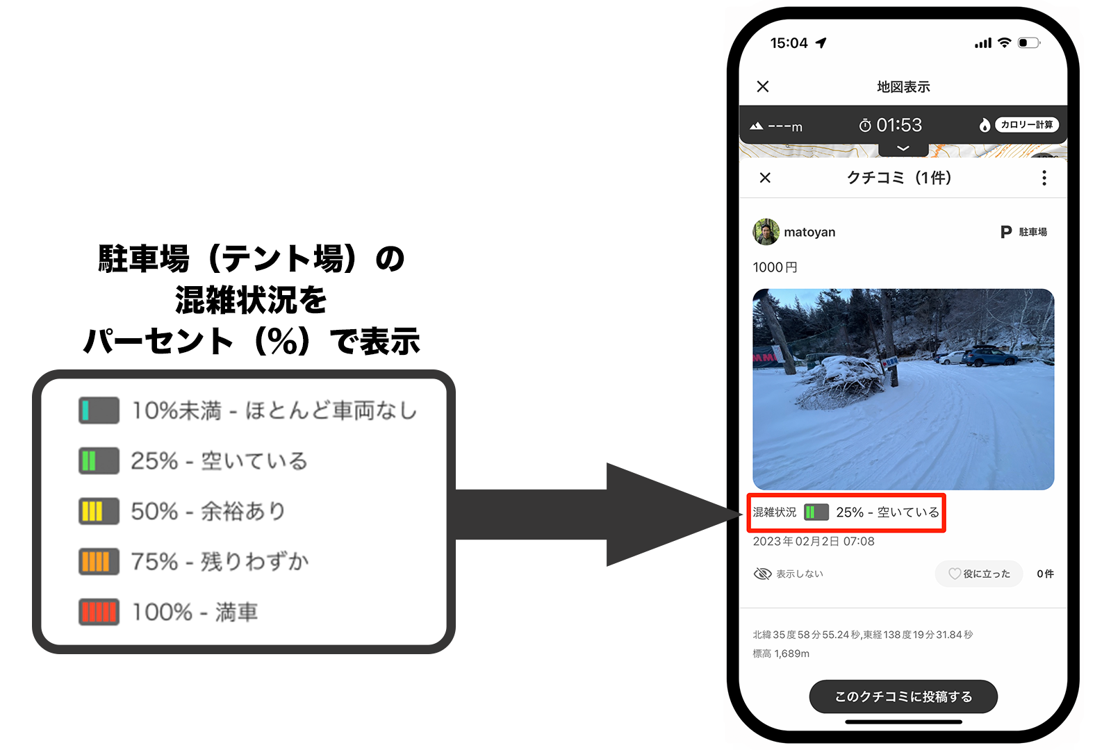駐車場とテント場の情報は混雑状況をパーセント(%)でも表示します。