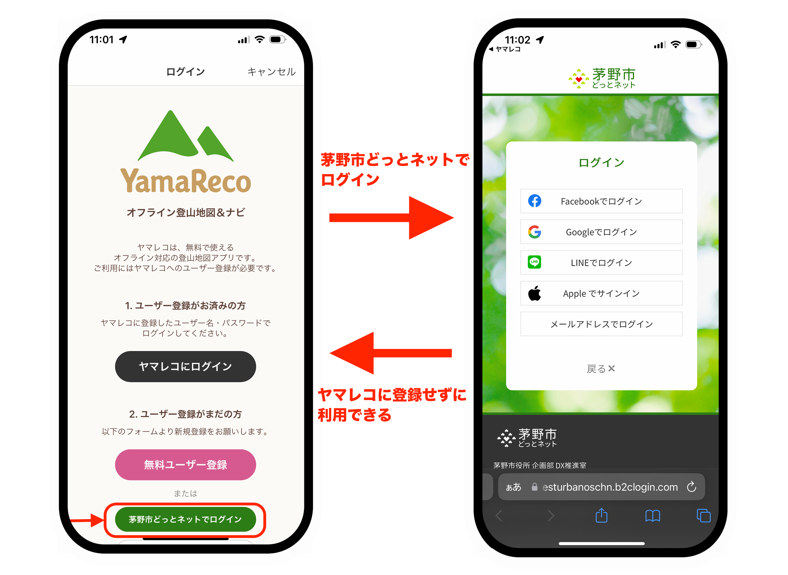 茅野市どっとネットのサイトでログインすると、ヤマレコアプリでもログインした状態で利⽤できます。