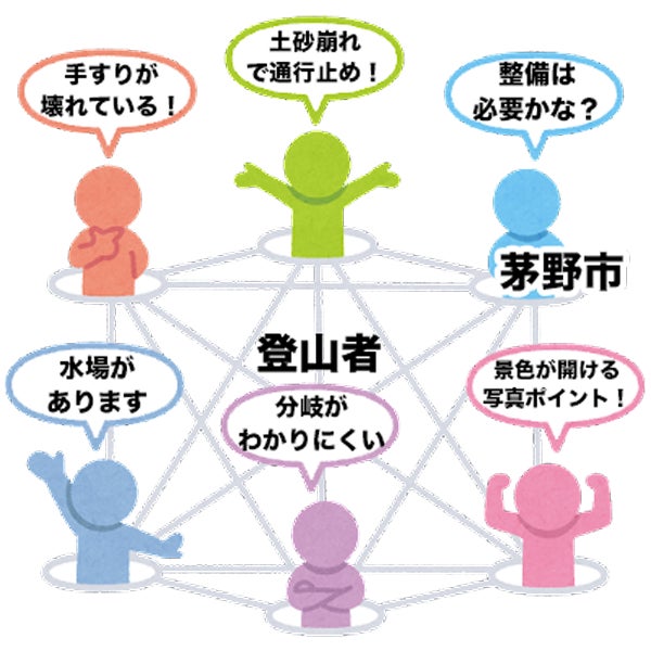 現地からのクチコミを登山者と行政で共有し、安全登山と登山道整備に活用します。
