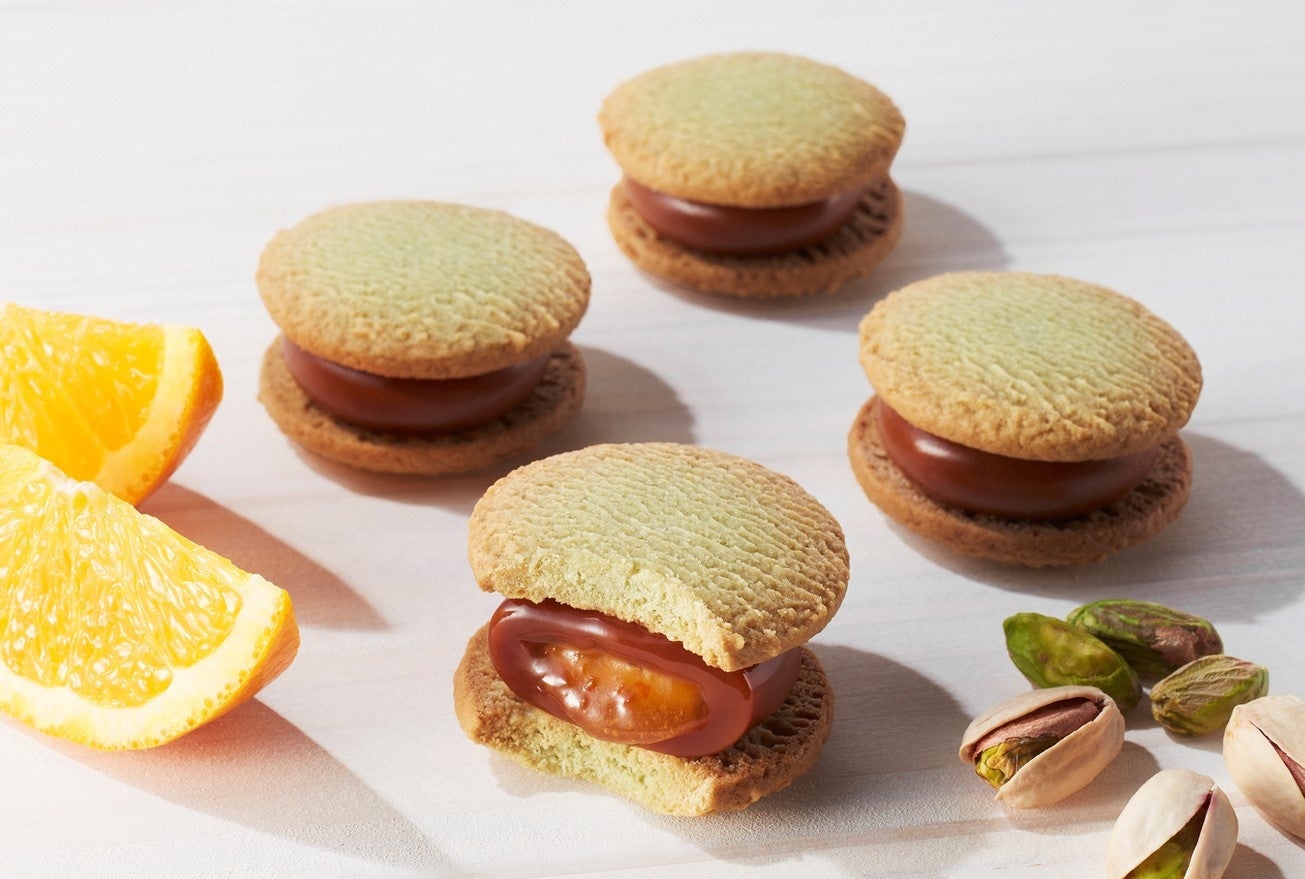 ピスタチオクッキーのサクサク感とオレンジソースを包んだとろりとくちどけの良いキャラメルが一度に味わえるぜいたくなサンドクッキーです。