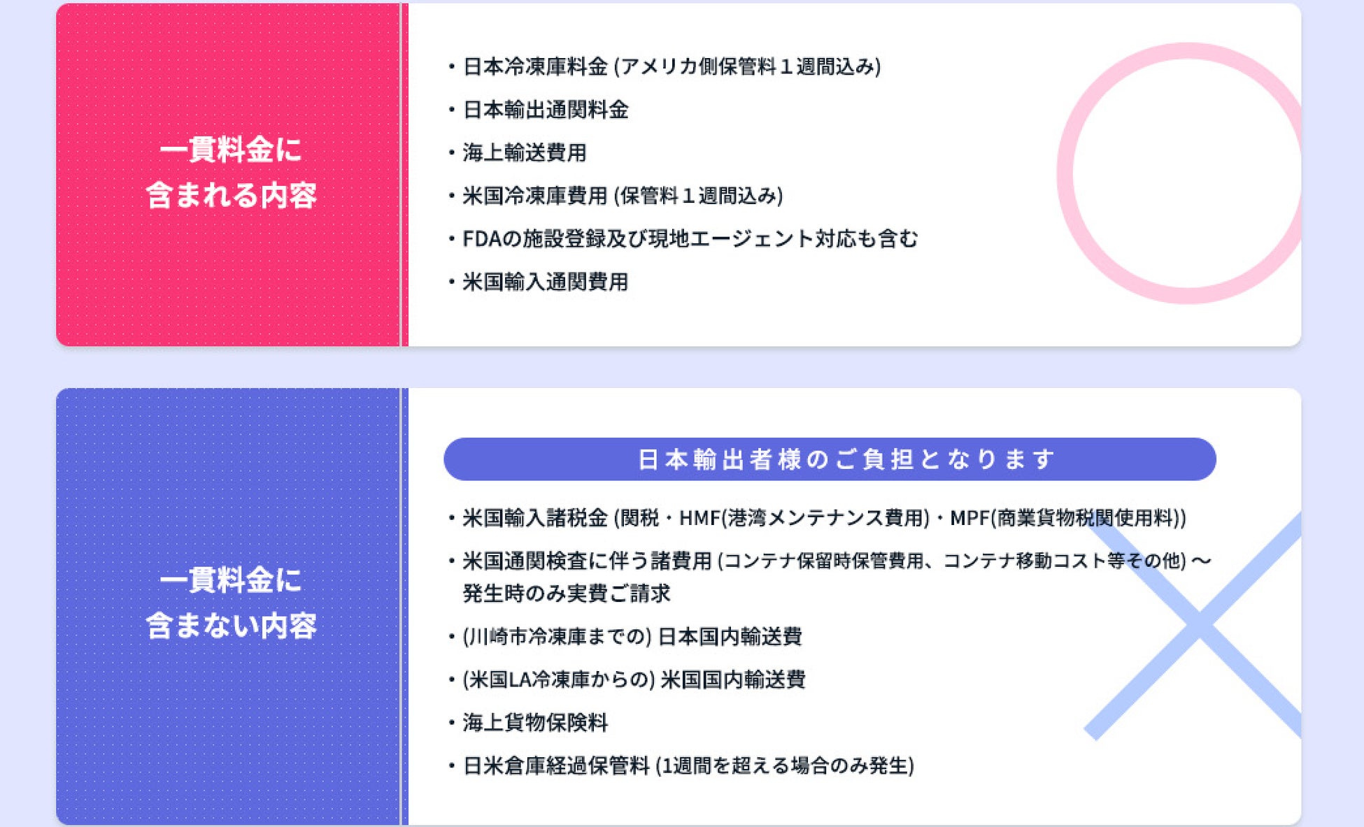 本サービスは日本側の輸出通関や海上輸送だけでなく、アメリカFDAの施設登録、原材料がアメリカ側の輸入規制に抵触しないかなどの輸入規制調査、アメリカ側での輸入者対応、オプションとはなりますが現地通関後の最終目的地までのアメリカ国内の冷凍輸送手配まで含んでおり、日本初のリーファーコンテナの混載と貿易対応がセットとなった冷凍輸送のワンストップサービスとなっております。