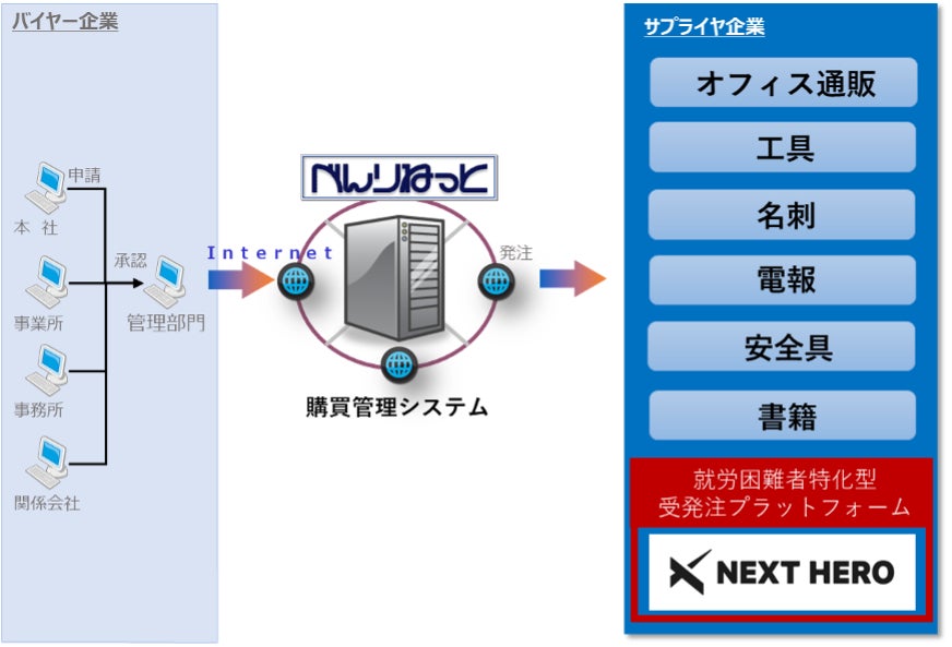 「べんりねっと」は、下記図のようにさまざまなサプライヤを接続することができる購買プラットフォームです。今回「NEXT HERO」と連携することで、見積依頼から発注までを「べんりねっと」で完結し、利用実績の全国一元管理を可能にします。
