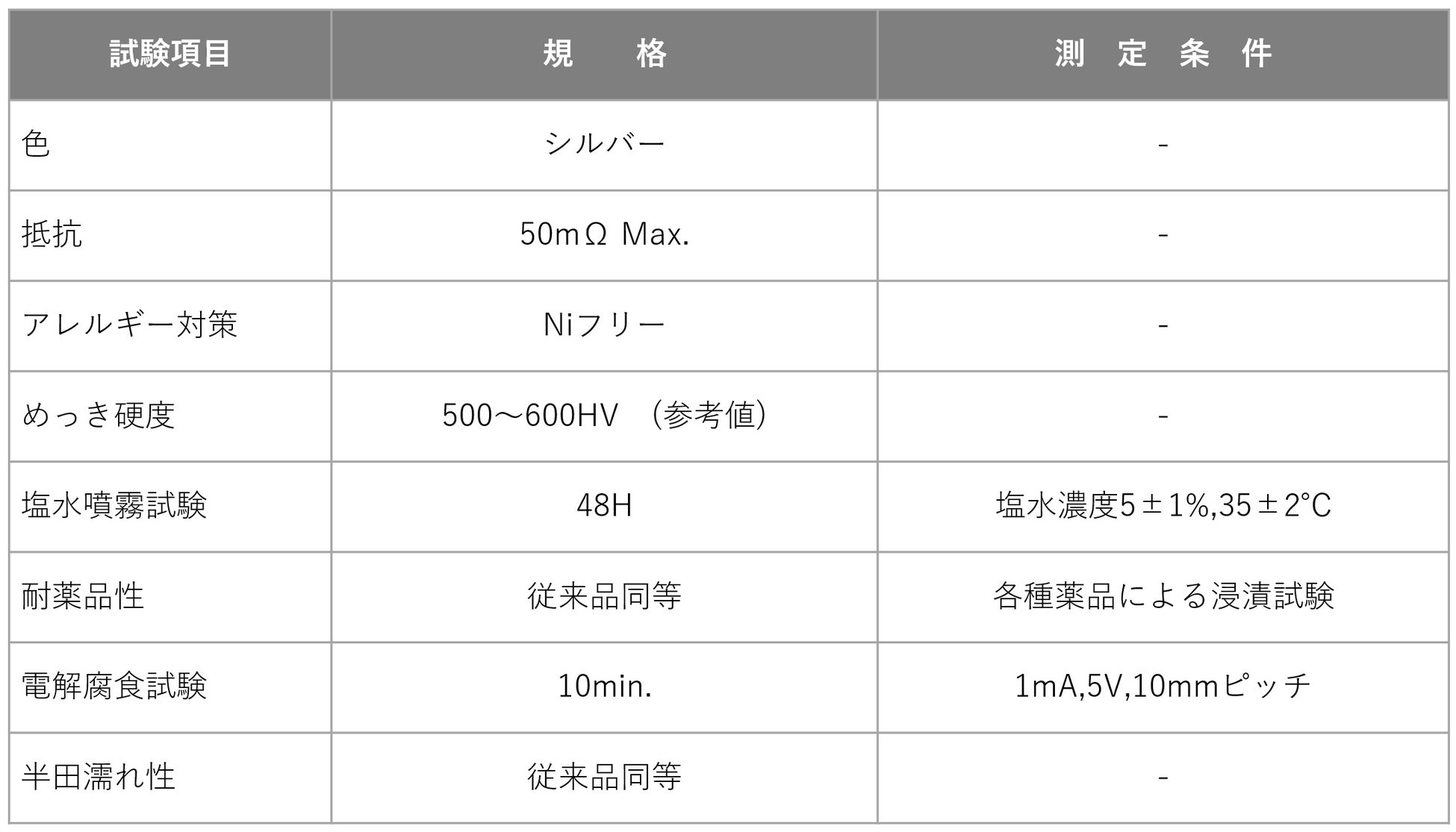 - 特殊めっきを施しており硬度が高いため、接点部の耐摩耗性にも有効