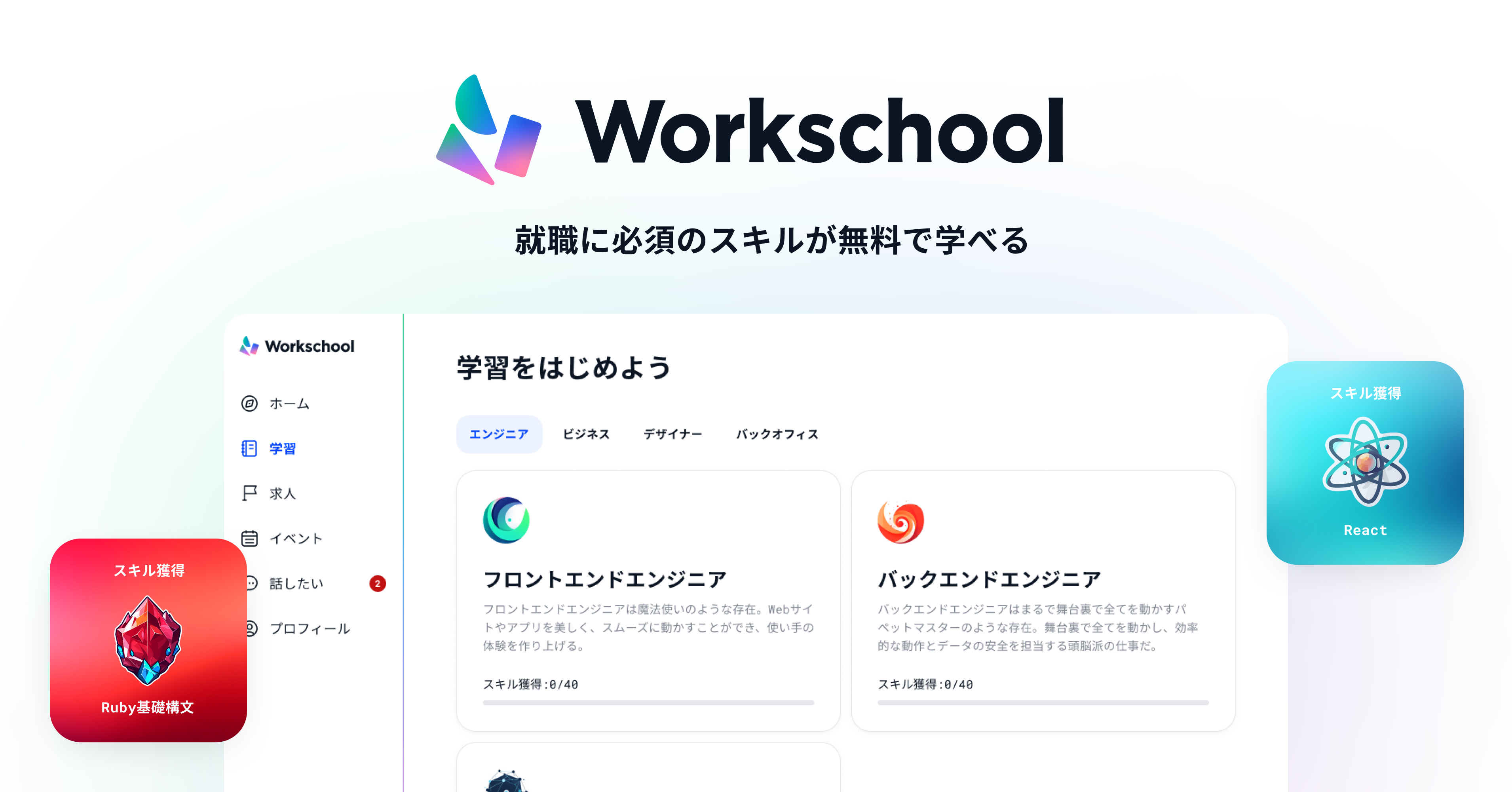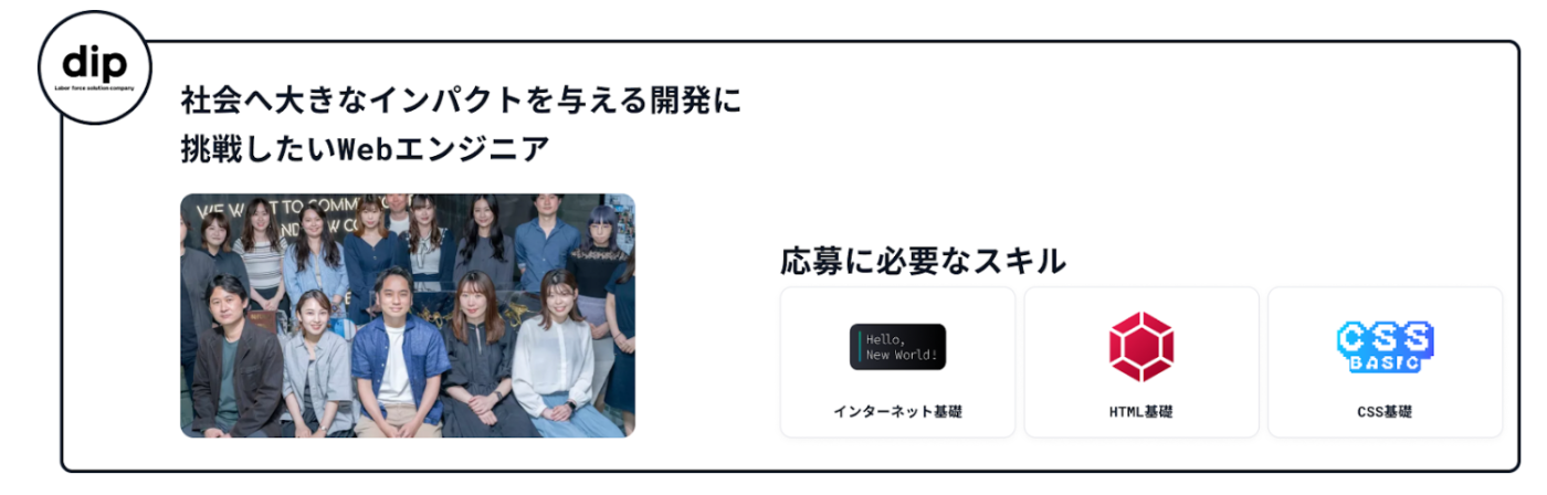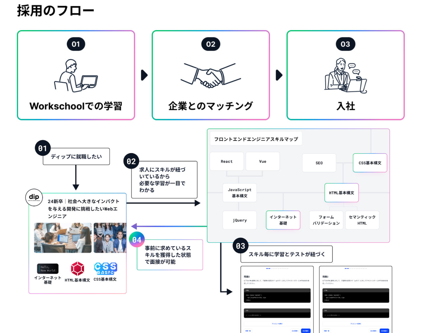 求人に対してどのスキルが必要かを定義し、求人に応じたスキルアップを求職者に無料で提供します。求人に紐づく学習を行うことで応募者は無料で求人に応じたスキルを習得することができます。