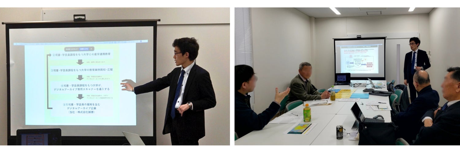 本研究の開始に先立ち、誠勝 社長室長の寳德 真大(以下:寳德)は、2024年3月17日(日)に「地域産業研究会(※1)」にて、司書・学芸員志望学生に対するデジタルアーカイブ利活用教育を体験するワークショップを実施しました。