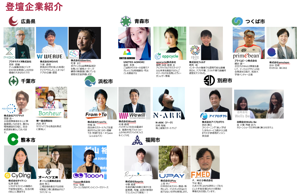 加盟自治体から選抜されたスタートアップ約20社によるピッチ(ショートプレゼンテーション)や、ブース展示を通じて、既存企業との出会いや新たなビジネスを創出します。