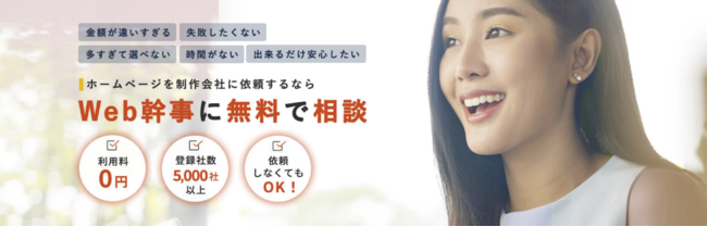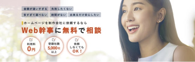 ユーティル社の中核旗艦サービスである「Web幹事」ではWeb制作の専門家が、お客さまに合った制作会社を無料でアドバイス。失敗しない制作会社選びを一つの窓口で行えるよう、5,000社以上の制作会社データベースから、専門家と比較検討いただけます。