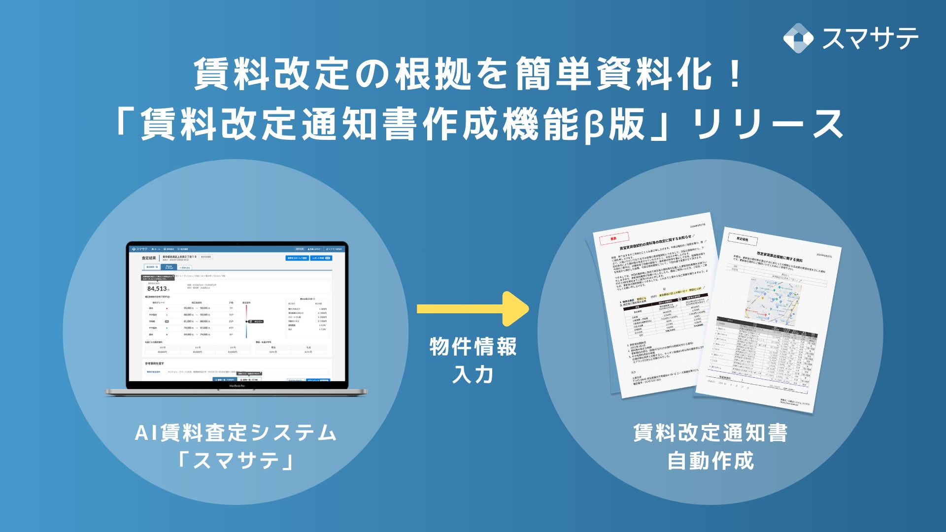 AI賃料査定システムを提供しているスマサテ株式会社(本社:東京都品川区、代表取締役:山岸 延好)は、2025年4月10日、賃貸管理会社向けシステム「スマサテ」において、「賃料改定通知書作成機能」のβ版をリリースしました。物価上昇や金利変動を背景に、賃料改定の必要性が高まる中、本機能は管理会社が適正な賃料改定をスムーズに進められるよう支援します。専門家監修の書式を採用し、周辺の賃料相場を自動でリストアップすることで、透明性の高い通知書の作成が可能です。