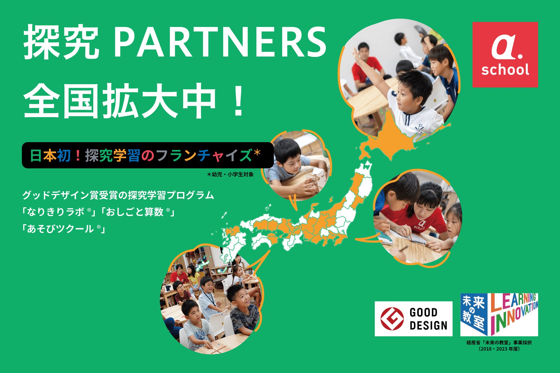 a.schoolが独自開発した小学生向け探究学習プログラム「なりきりラボ」「おしごと算数」の普及に向けたパートナーシップ(フランチャイズ)で、全国に広がる学び提供者(以降「パートナー事業者」)が加盟しています。業態は学習塾から民間学童、保育園、福祉施設、オルタナティブスクールまでさまざまですが、「子どもたちが主役となって、身の回りの社会と直結する"生きた学び"を心から楽しむ」という理念を共有しています。なお、同プログラムは、探究学習の普及に資するとして2019年度グッドデザイン賞を受賞しております。