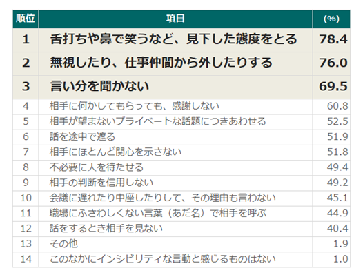 あなたが「インシビリティな言動」だと感じるものをすべて選んでください。(複数回答可)