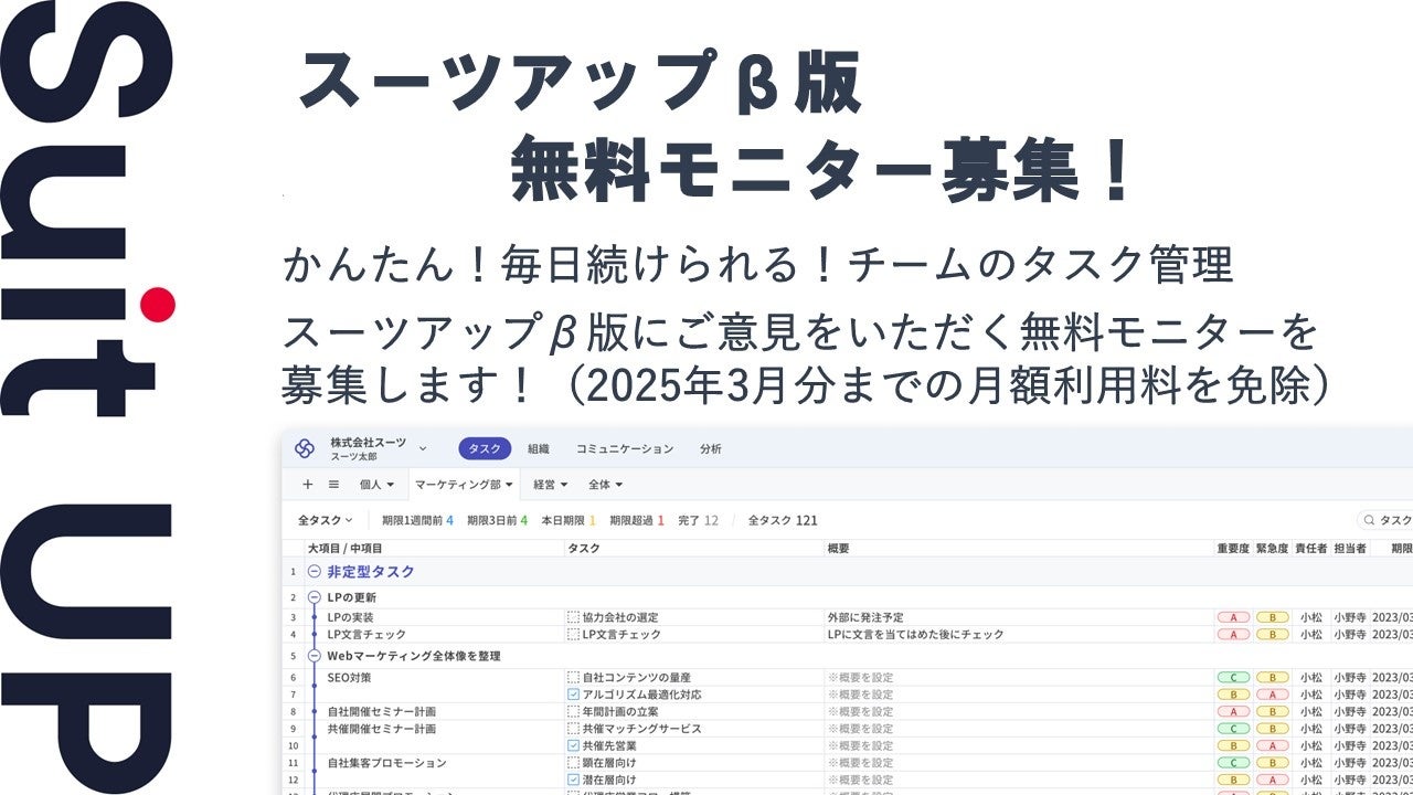 この度、株式会社スーツ(所在地:東京都千代田区、代表取締役社長CEO:小松 裕介)は、チームでかんたん、毎日続けられるプロジェクト・タスク管理ツールの経営支援クラウド「Suit UP」(スーツアップ)β版の無料モニターを募集いたします。