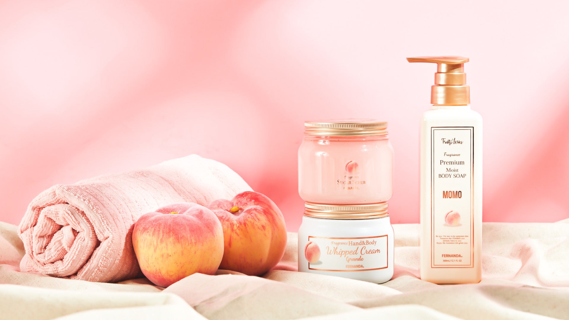 『FERNANDA POPUP EVENT』では、FERNANDAが桃農園のモリタファーム(山梨県笛吹市、代表:森田絵美)と共同開発で廃棄予定の桃から抽出したエキス「アップサイクルモモ果実エキス」を配合した、サスティナブルフレグランス「Body Splash(ボディ スプラッシュ)」をはじめとした「モモコレクション」(6月24日より数量限定発売)を展示しトライアルして頂けます。香りの特徴は、まさに、もぎたてフレッシュな桃そのもの。甘くとろけるような桃をベースに、甘酸っぱいプラム、爽やかで優しい甘さのピーチブロッサムを加えました。『FERNANDA POPUP EVENT』では、いち早く新作の香りをお試し頂けます。