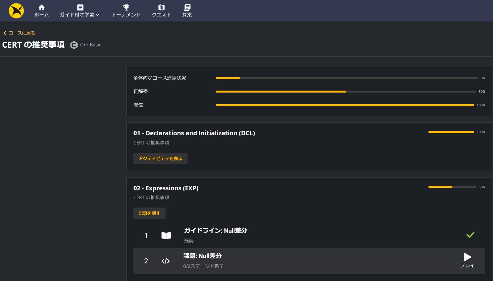 Secure Code Warrior は、CERT C++の他にもOWASP Top 10 や、PCI DSS、EO-Critical Software、Secure Code Warrior 社推奨など、多くの学習コーステンプレートが用意されており、目的に合わせて、カスタマイズできます。加えて、ゲーム感覚でセキュアコーディングスキルを競い合うトーナメントという機能が備わっており、セキュリティを意識するだけでなく、組織全体でセキュリティがあたりまえといったセキュアコーディングに対する意識や学習意欲の向上を促します。