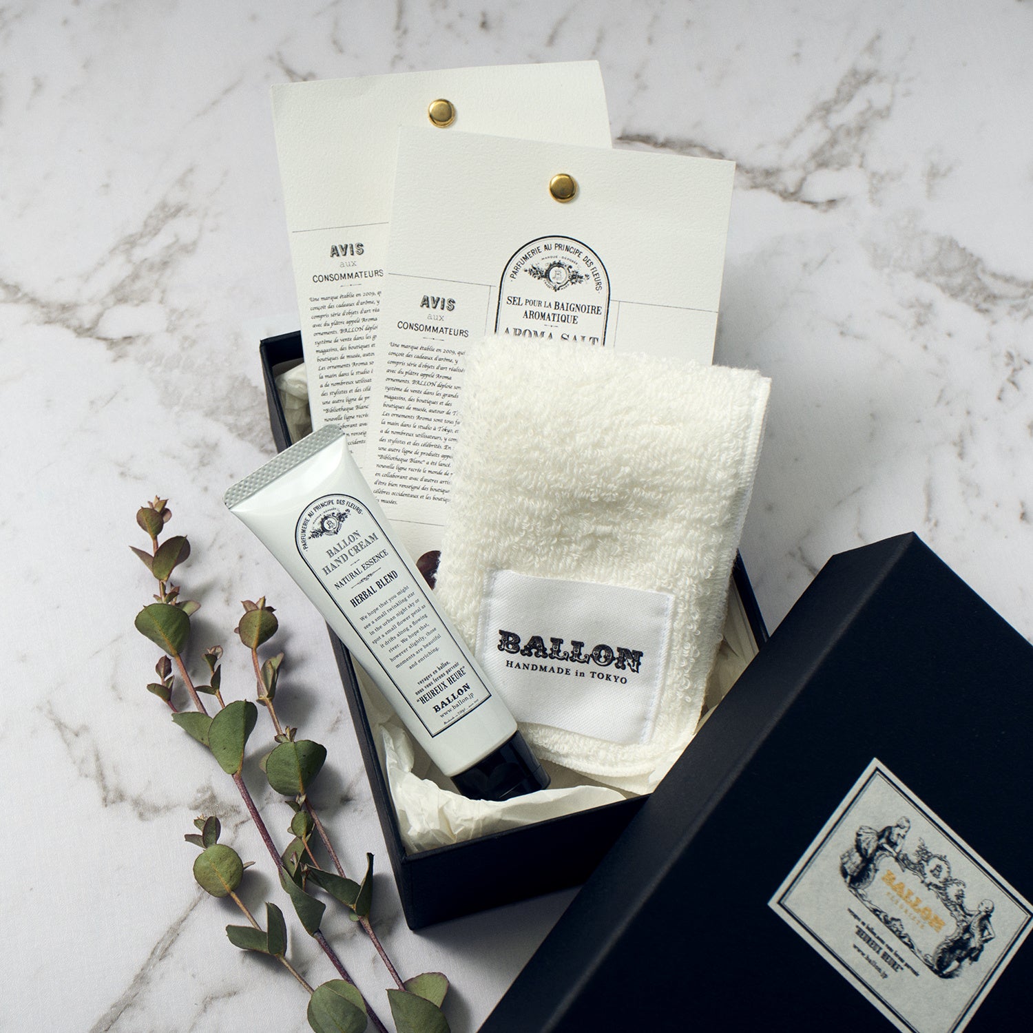 セット内容:ハンドクリーム(ローズor ハーバル)、アロマバスソルトTrial&Travel Pack2種(ローズ、ハーブフォレスト)、IKEUCHI ORGANIC 今治オーガニックハンドタオル
