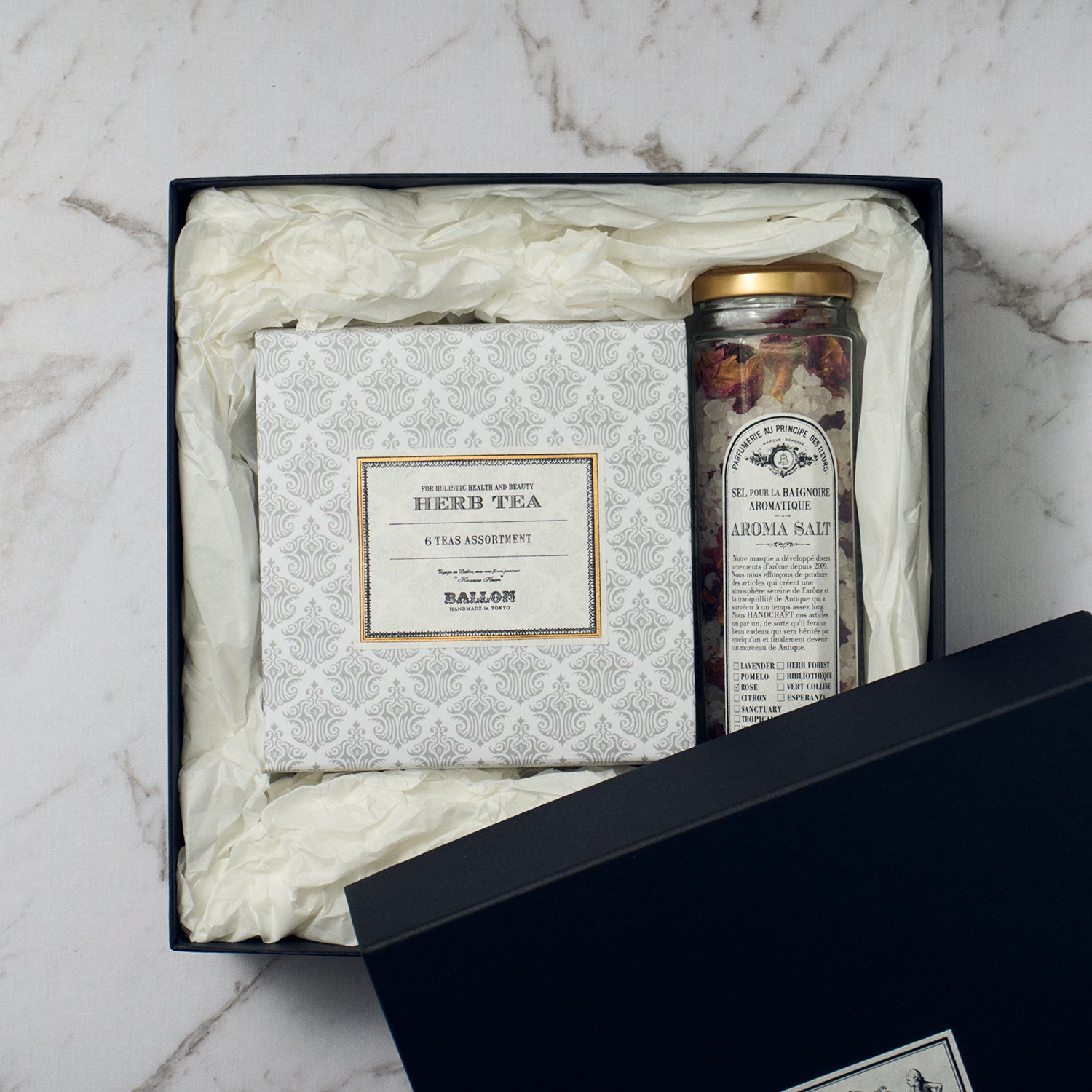 セット内容:ハーブティーアソート(6種各1包)、アロマバスソルト(ローズ)