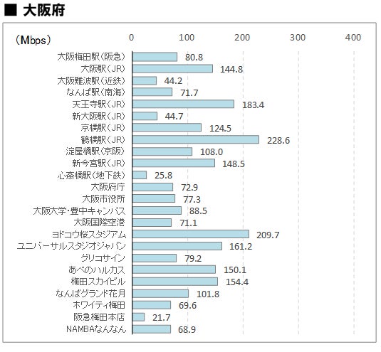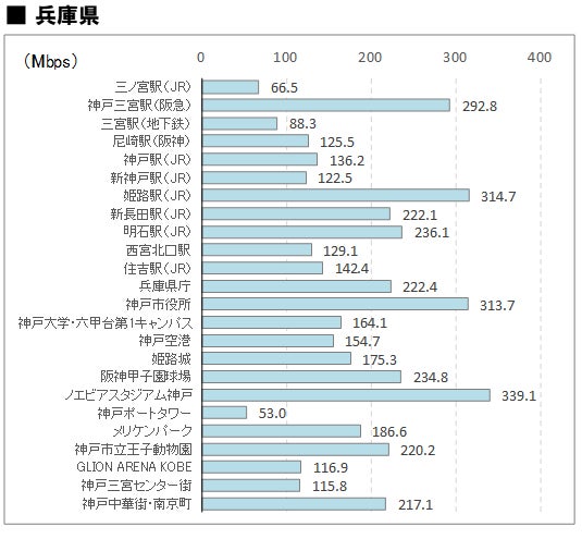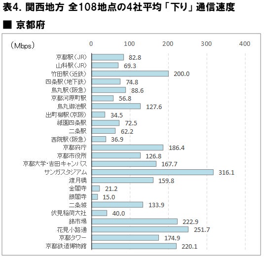 測定地点ごとに見ると、今回調査における下り通信速度の最速地点は兵庫県のノエビアスタジアム神戸であり、4社平均下り速度は339.1Mbpsであった。他に300Mbpsを超えた地点は、近江八幡駅(317.2Mbps)、サンガスタジアム(316.1Mbps)、姫路駅(314.7Mbps)、神戸市役所(313.7Mbps)、キーノ和歌山(302.3Mbps)である。一方で、4社平均の下り速度が最も遅かったのは、銀閣寺(15.0Mbps)であった。他に30Mbpsを下回った地点は、奈良公園バスターミナル(15.8Mbps)、東大寺南大門(19.6Mbps)、金閣寺(21.2Mbps)、阪急梅田本店(21.7Mbps)、法隆寺(23.1Mbps)、心斎橋駅(25.8Mbps)である。関西地方は他の地方と比べて、4社平均の下り通信速度が極めて速い地点も多いが、遅い地点もまた多い結果となった。