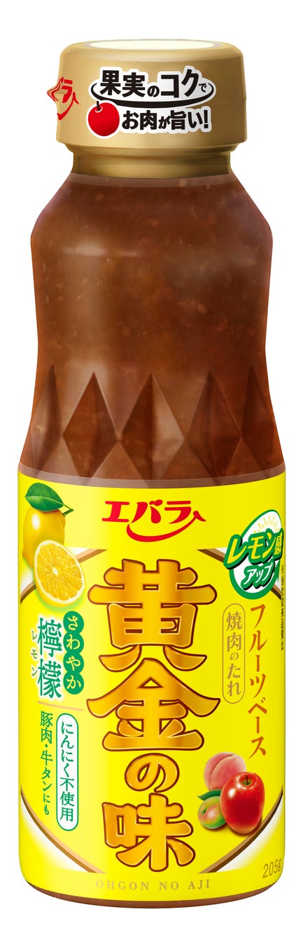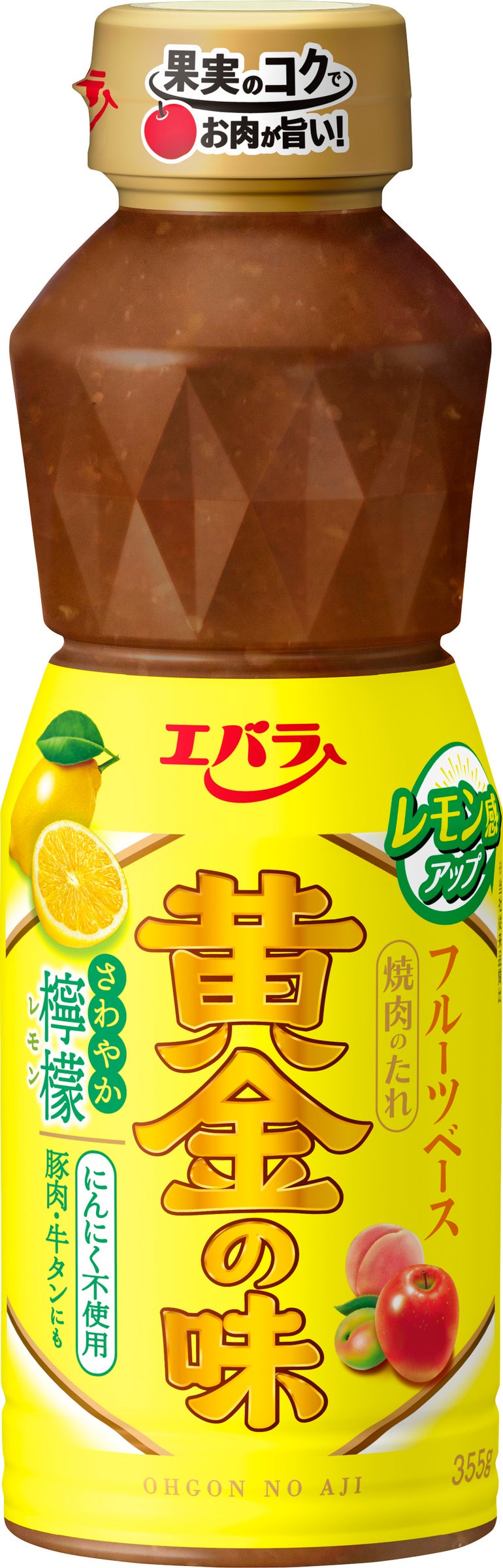「黄金の味 さわやか檸檬」は、リンゴ、モモ、ウメにレモン果汁、レモンピール、レモンエキスの3種のレモン原料を加えた、さわやかな風味とさっぱりとした甘みが楽しめるフルーツベースの焼肉のたれです。ニンニク不使用なので、においを気にすることなくお使いいただけます。