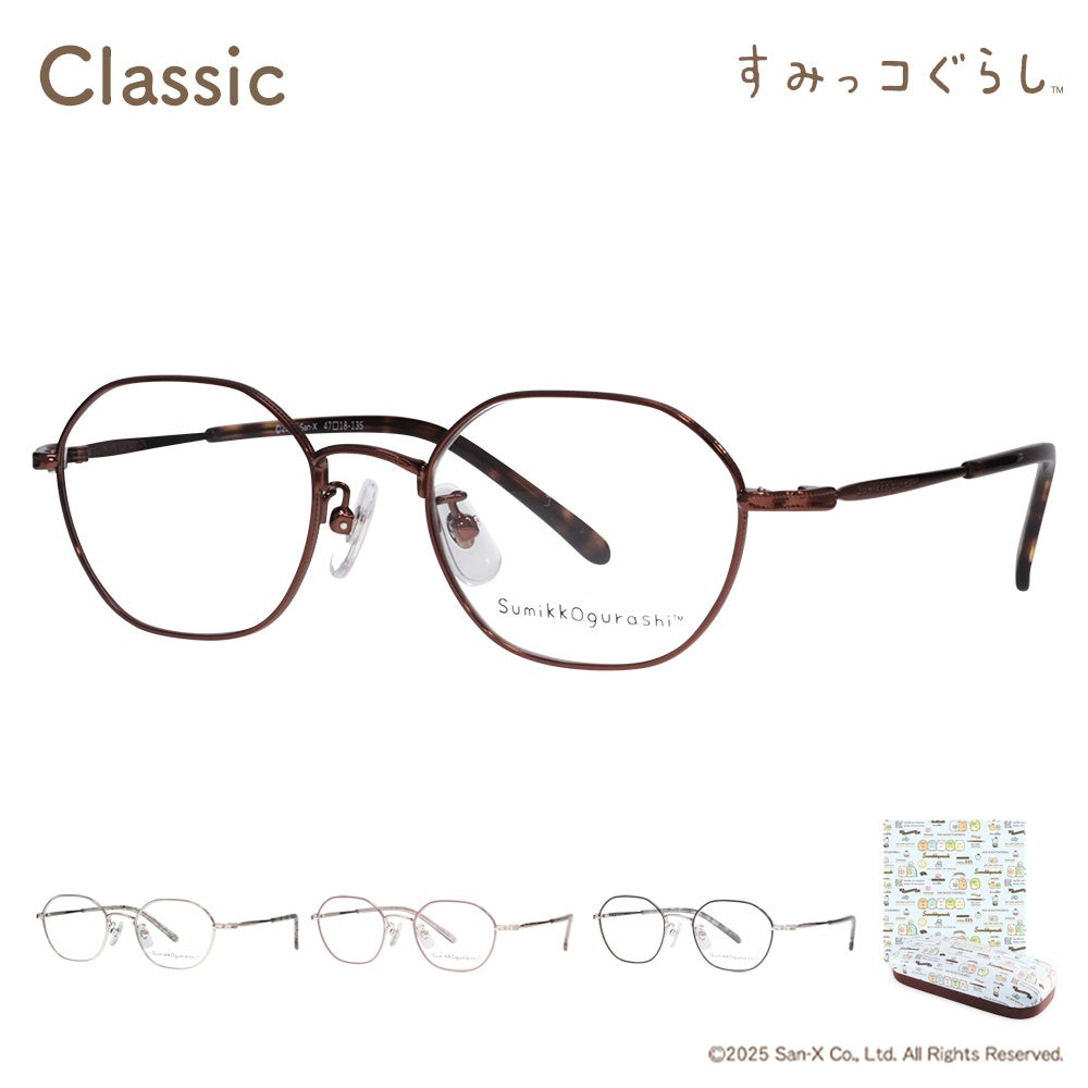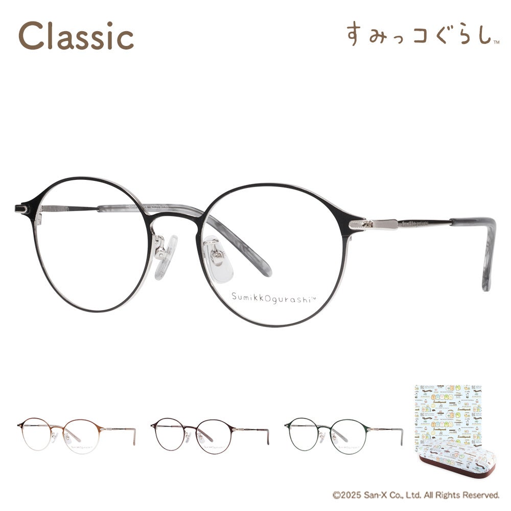 上品でクラシカルなフレームでテンプル内側にはすみっコの刻印、外側にはロゴ入りで、上品なアクセントに。少し大人っぽいデザインをお探しの方にもおすすめ。カラーは全4色