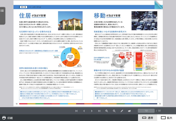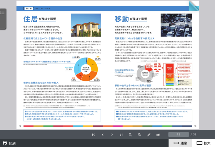 ●生活への影響:世界各地で起きている災害や生態系の損失、食糧や健康などへも及ぶ気候変動の影響と、国内外の具体的な取り組み事例を紹介し、自分に引きつけて考えるための問いを設置。