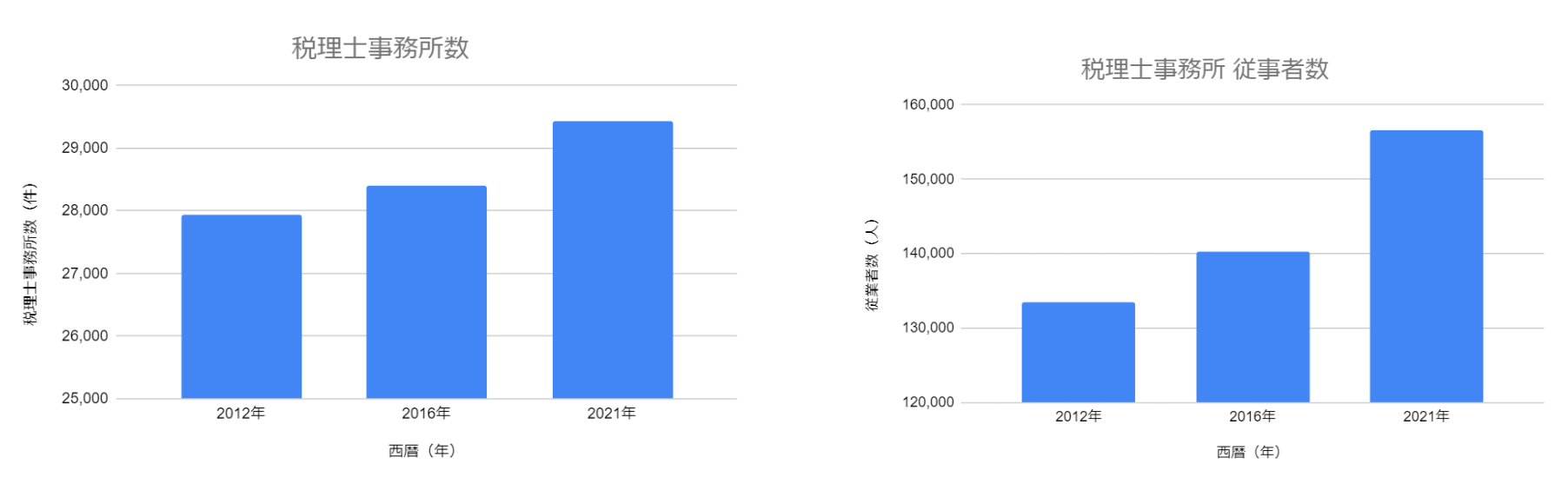 2012年から2021年までの10年間で、税理士事務所の数と従事者数は増加している。