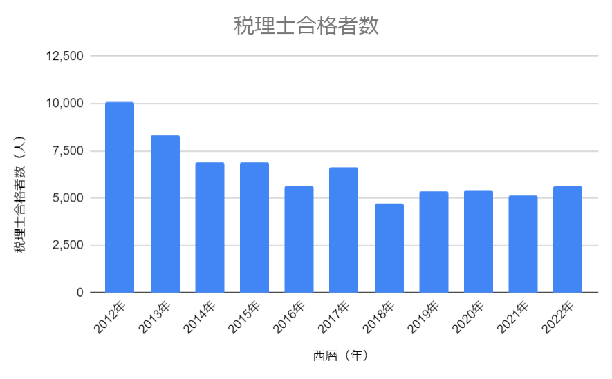 一方、2012年から2021年までの10年間で、税理士試験の合格者数は半減している。