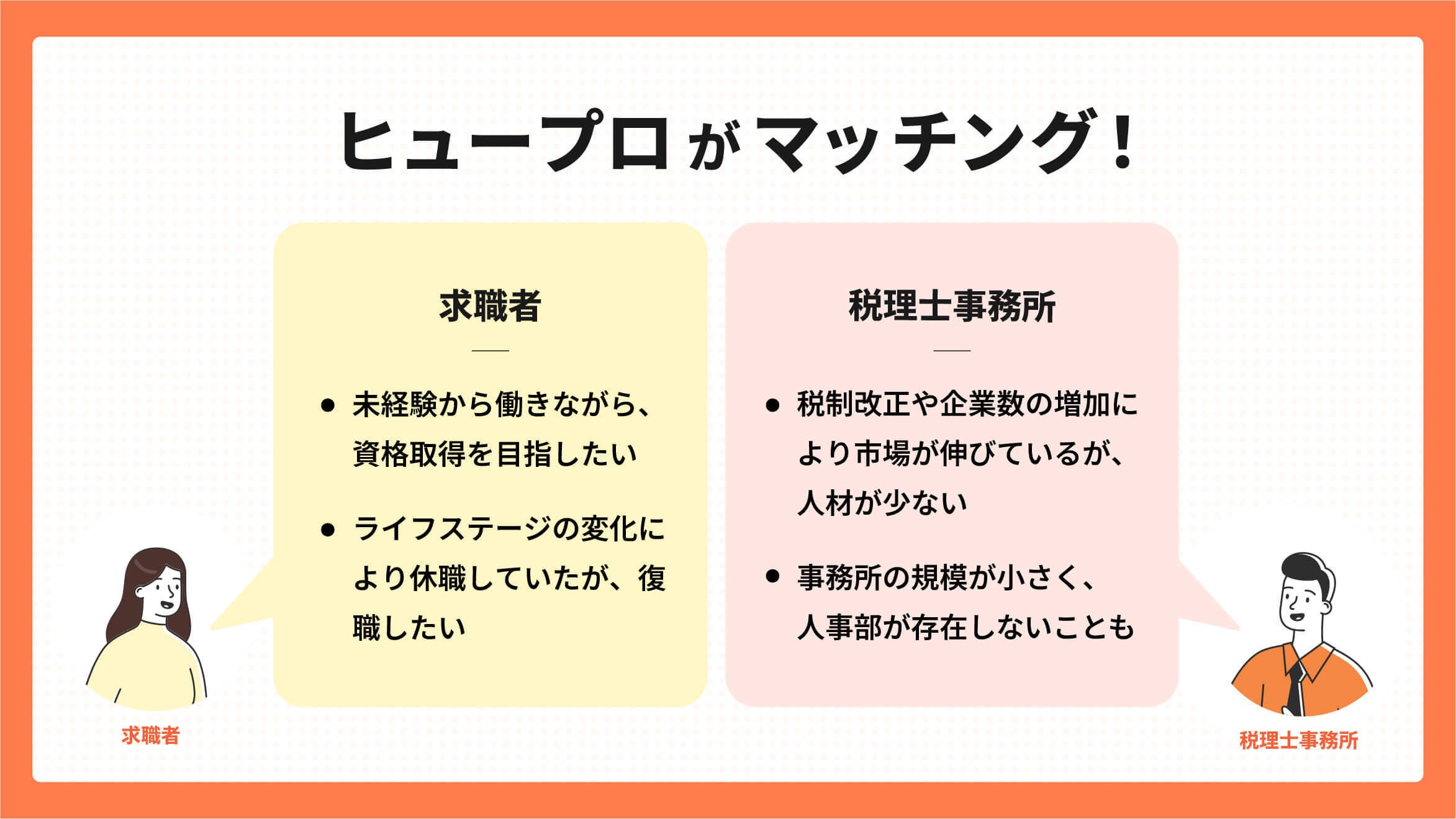 『ヒュープロ』では、全国の税理士事務所の求人を紹介し、税理士事務所側の課題と求職者側の課題を解決している。