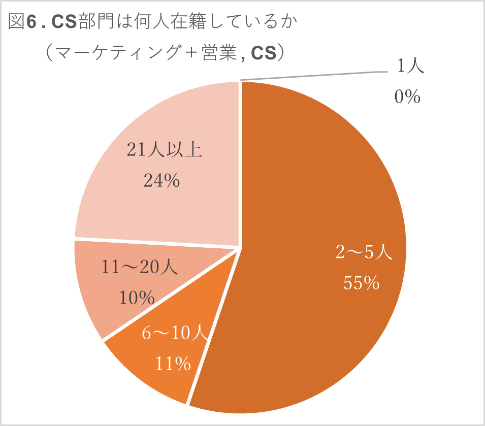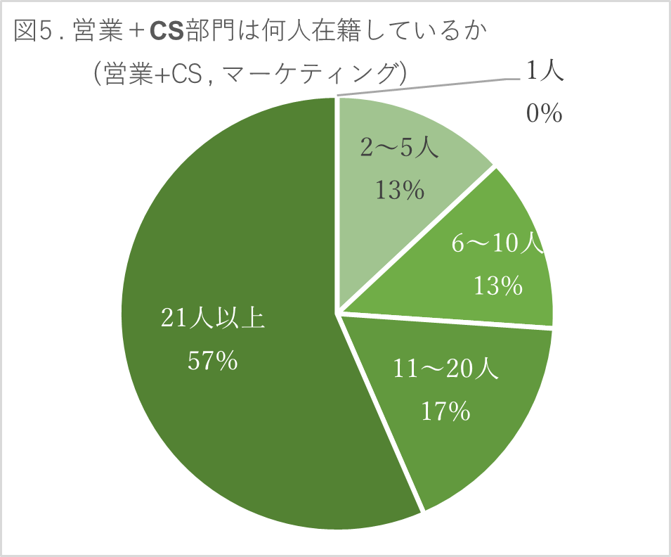 「『営業』と『カスタマーサポート』が同一部門」と答えた企業に、「『営業』『カスタマーサポート』部門は何人在籍しているか」という質問をしたところ、「21人以上」と答えた企業は約57%でした。
