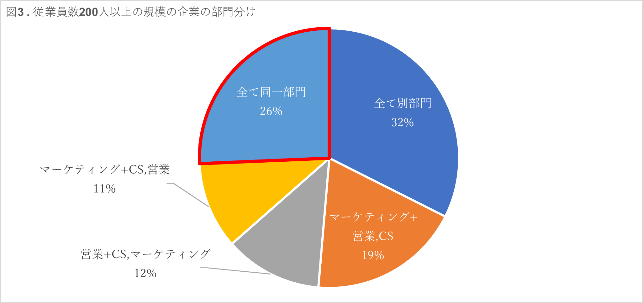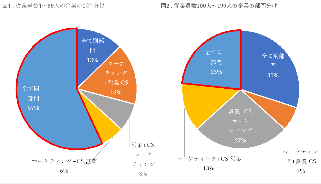 「『マーケティング/販促』と『営業』と『カスタマーサポート』の部門は分かれているか」という設問に対して、従業員数が「1~99人」「100~199人」「200人以上」の3つのグループに分けて比較。「全て別部門」がそれぞれ13%、30%、32%、「全て同一部門」はそれぞれ57%、23%、26%という結果になりました。従業員数100人未満の企業では、一つの部門が様々な業務を担っている傾向にあることがわかりました。