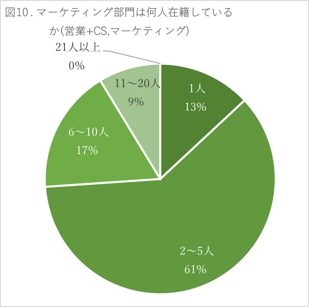 また、「営業」と「カスタマーサポート」が同一部門で、「マーケティング/販促」は別部門である場合も、「マーケティング/販促」部門の人数に「2~5人」を選んだ企業は約61%となりました。