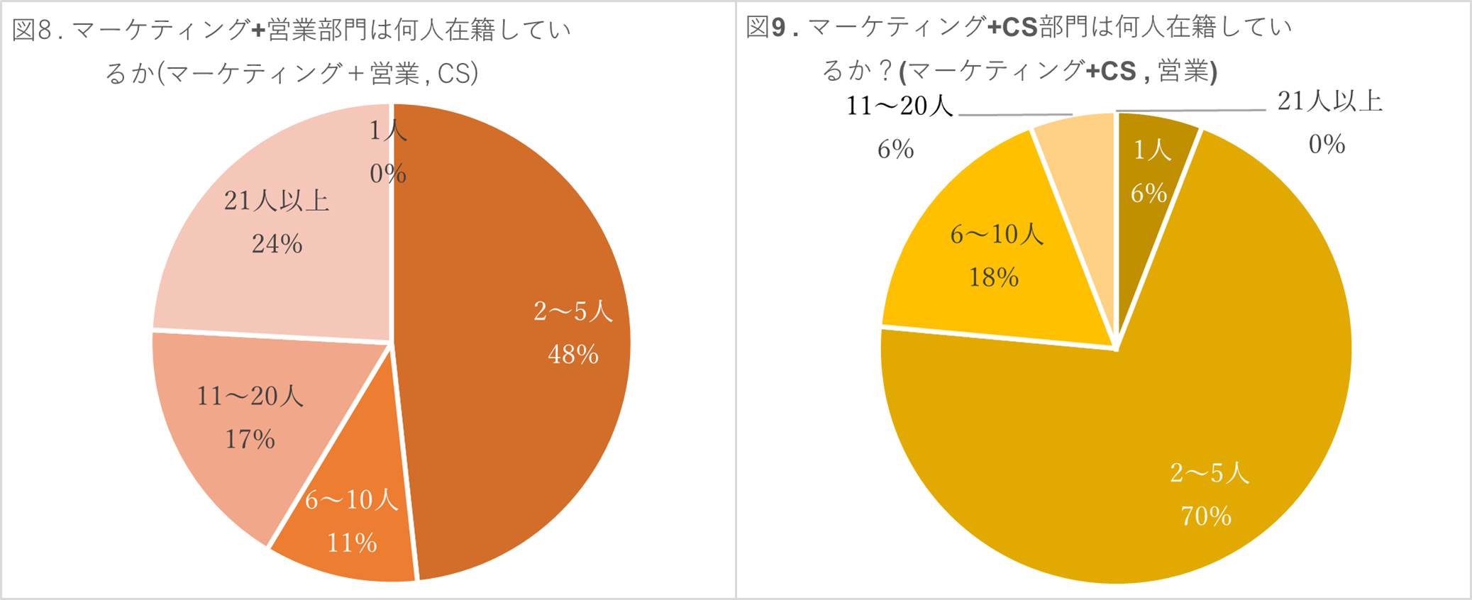 「マーケティング/販促」と「営業」が同一部門である場合(図8)も、部門の人数は「2~5人」と答えた企業が約48%、「マーケティング/販促」と「カスタマーサポート」が同一部門である場合(図9)は、マーケティング/販促部門の人数は「2~5人」と答えた企業が約70%にものぼりました。