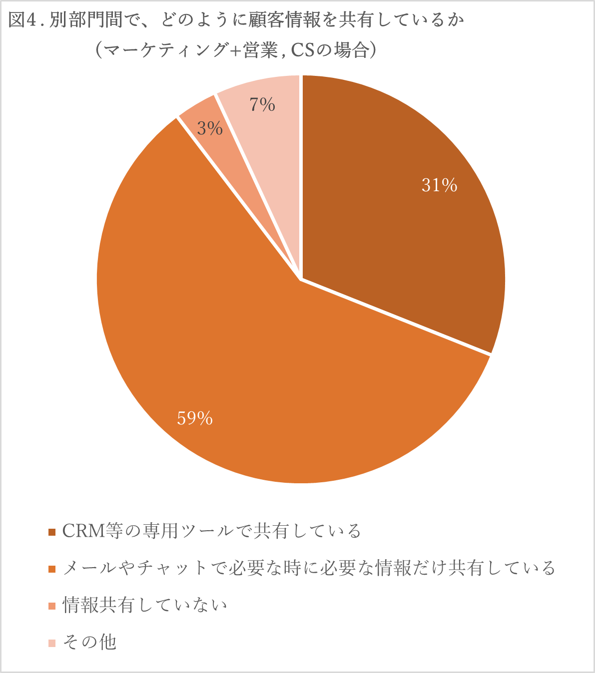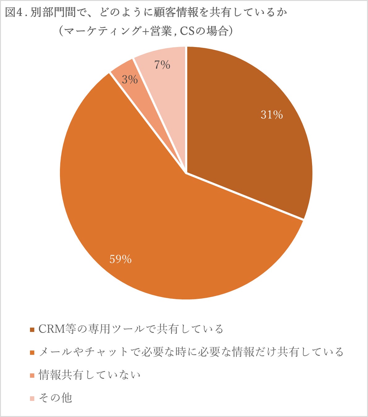 「別部門間で、どのように顧客情報を共有しているか」という設問に対して、「メールやチャットで必要な時に必要な情報だけ共有している」と答えた企業が全体の約26%、「CRM等の専用ツールで共有している」と答えた企業が全体の約19%となりました。