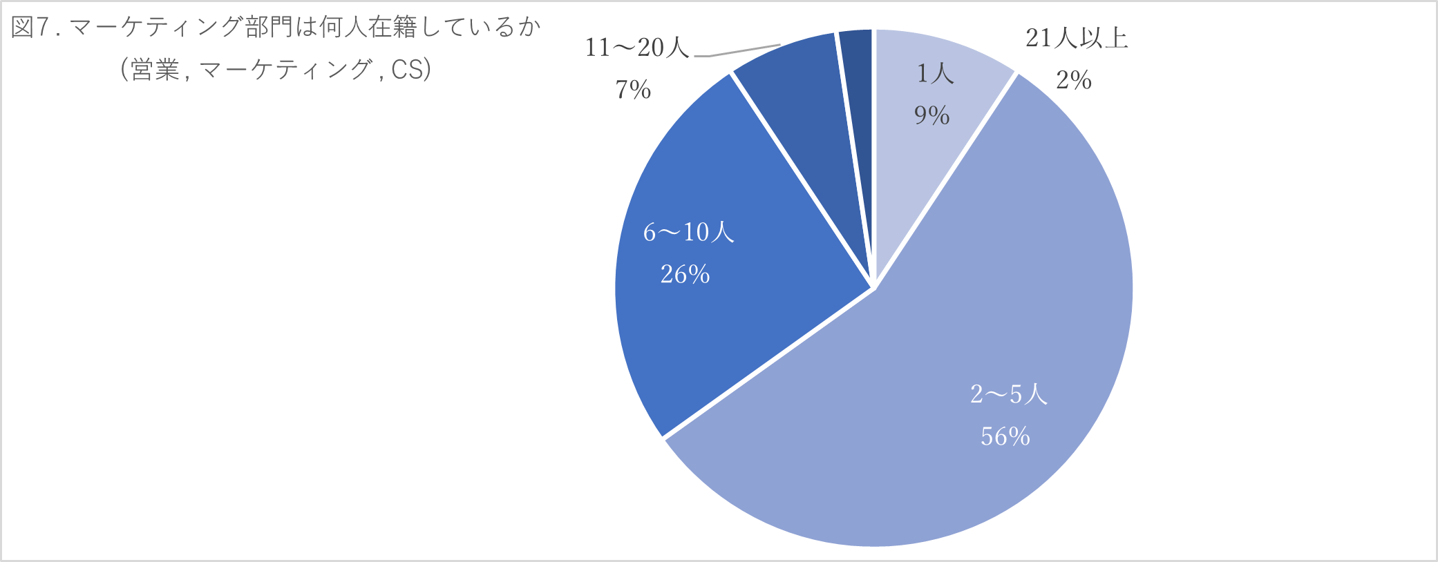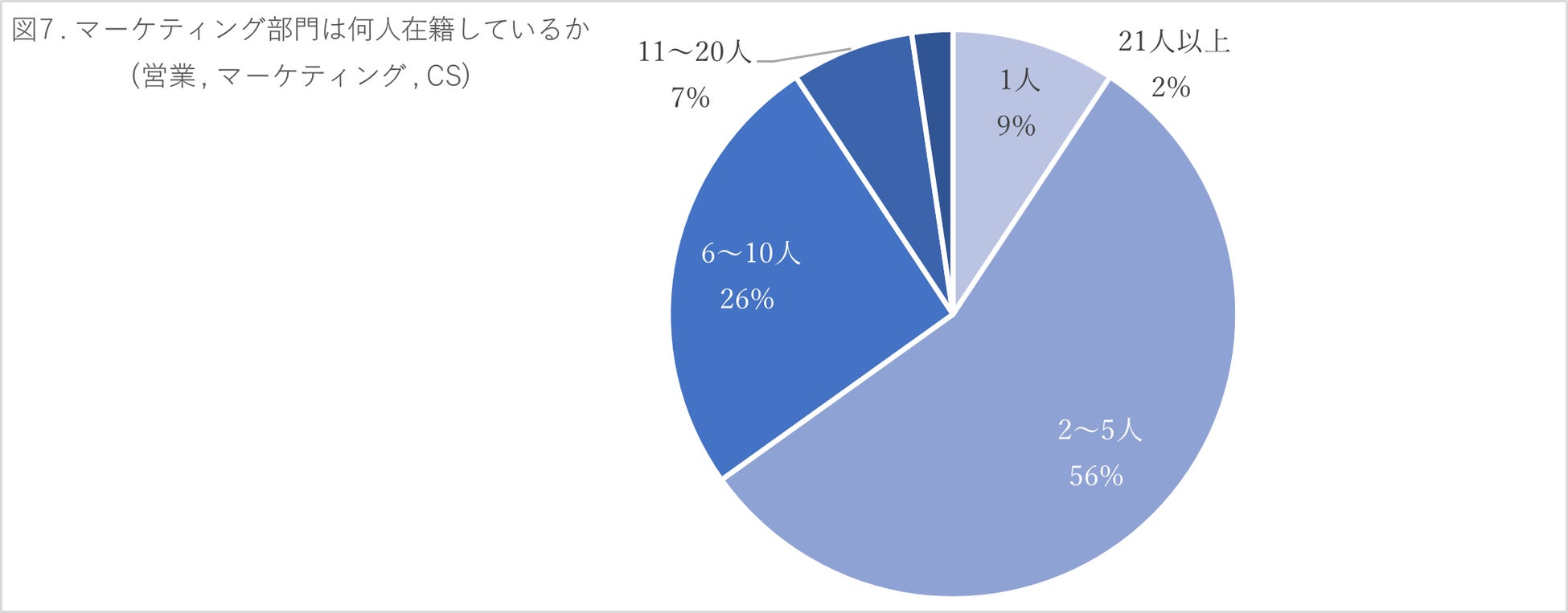 「『営業』『マーケティング/販促』『カスタマーサポート』は、全て別部門」と答えた企業の「マーケティング/販促」部門の人数は、「2~5人」が約56%と、最も多くなりました。