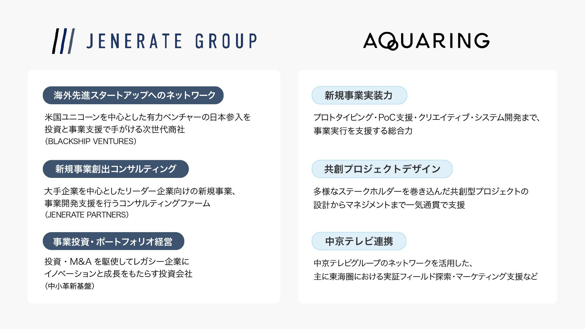 本提携は、アクアリングが持つ中京テレビグループのネットワークと新規事業のフルスタック実行力、そしてJenerate Groupが有する米国を中心とした世界中のスタートアップに関する豊富な知見と探索ネットワークを結びつけることで、地域発のイノベーションを加速することを目指すものです。