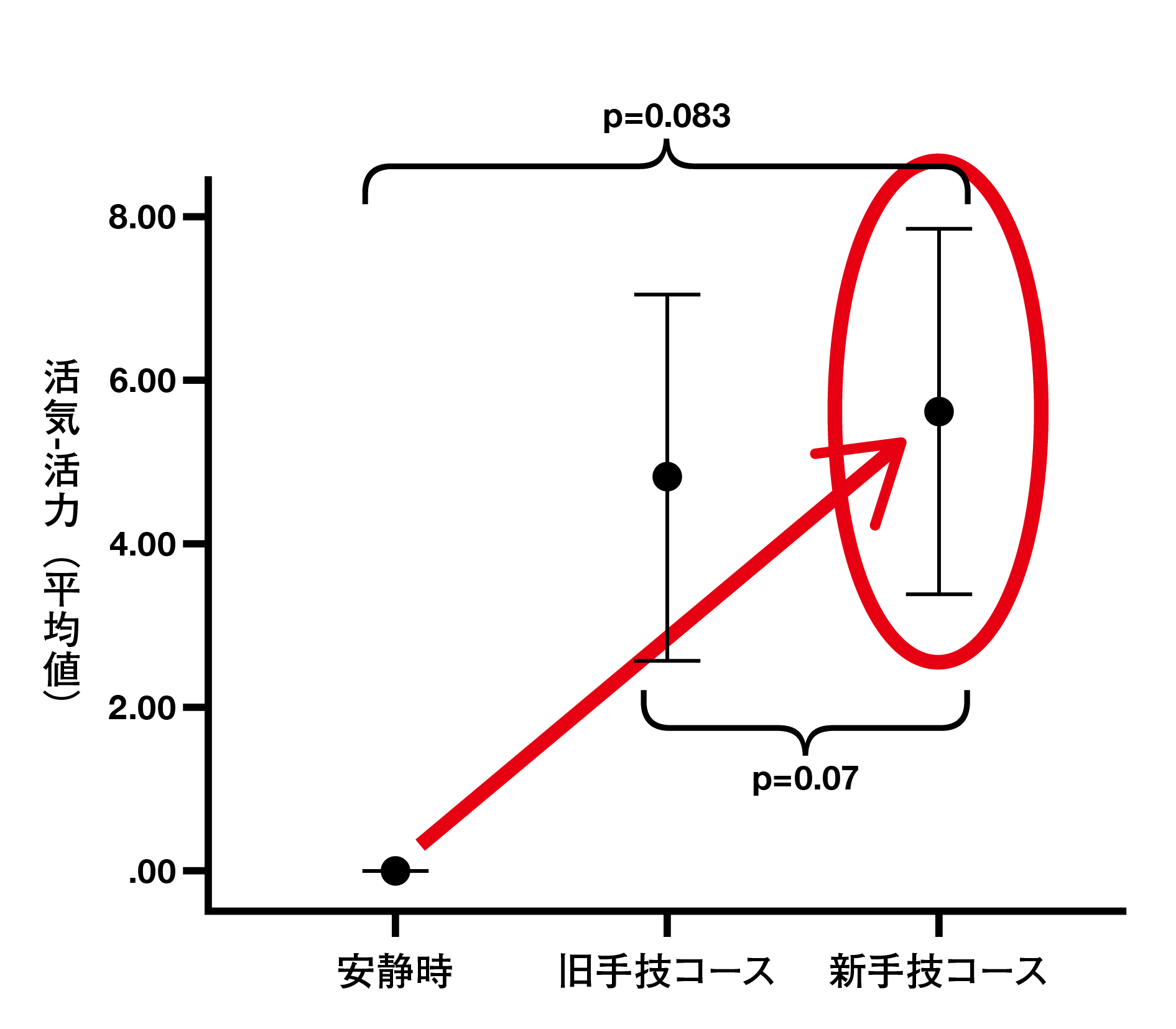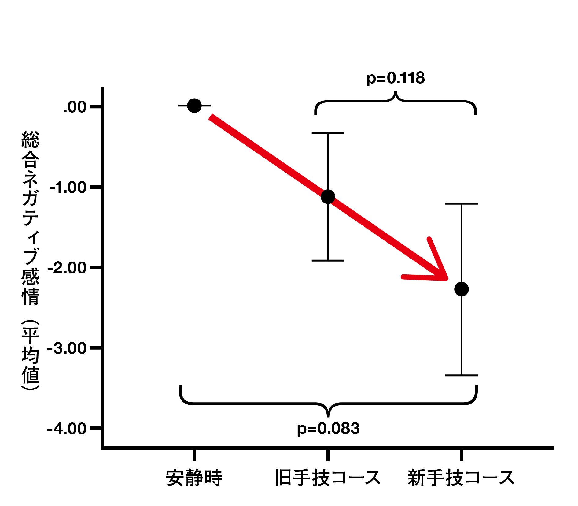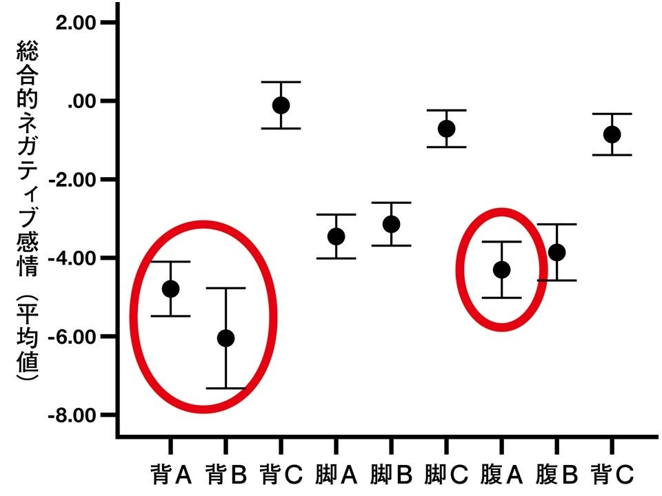 新手技Aの腹部、新手技Bの背中の手技後に、総合的なネガティブ感情が優位に減少することがわかった。